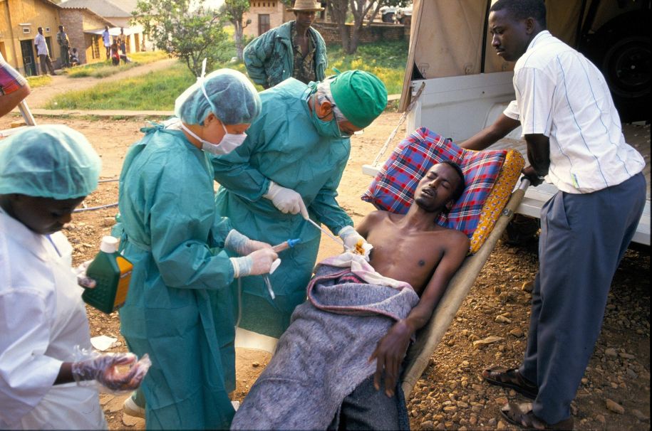1994, c’est le génocide au Rwanda. Nous travaillons en collaboration avec le Comité International de la Croix Rouge (CICR) dans une école devenue un ilot de secours au milieu du drame humain. MSF déploie en quelques heures le kit chirurgical pour 300 interventions, contenant tout le matériel nécessaire à ce type d’urgence. Il faut souligner que sans l’appui (médical, mais aussi l’approvisionnement en eau, électricité, le système de stérilisation etc.) de la logistique à MSF, nous n’aurions pas pu développer notre activité chirurgicale.