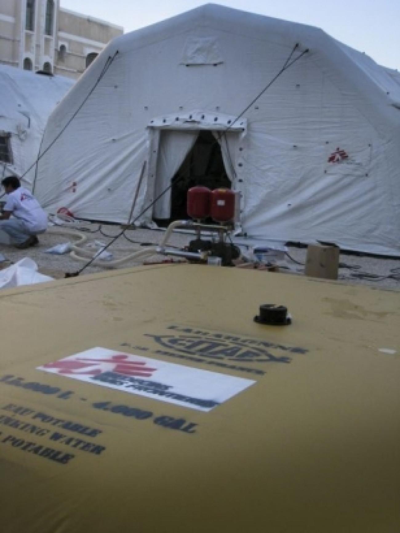 MSF a également pu faire entrer 21 tonnes de matériel médical dont deux tentes hospitalières gonflables destinées à mettre en place une unité de soins intensifs de 10 lits et deux blocs opératoires. MSF installe un hôpital indépendant pour se concentrer sur des besoins spécifiques : chirurgie réparatrice et orthopédique, soins aux brûlés...