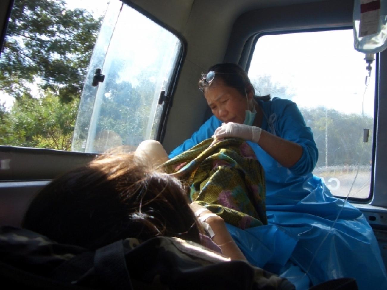 Blia, l’une des sages-femmes de l’équipe doit effectuer un accouchement en urgence lors d’un transfert vers l’hôpital.