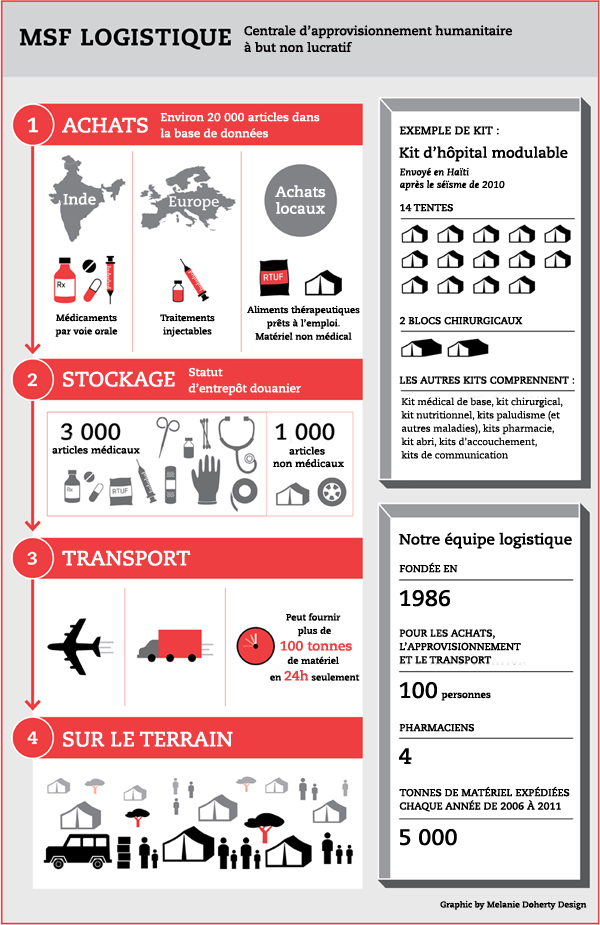 Il n’existe nulle part ailleurs dans le monde un centre logistique civil pouvant fournir des médicaments et des produits non-médicaux et plus de 500 kits prêts à l’emploi, conçus pour des types d’urgence spécifiques. MSF a été la première à développer cette approche et reste la seule organisation humanitaire à l’utiliser. Nous sommes souvent contactés par d’autres organisations s’intéressant à nos kits, mais nous ne possédons pas les capacités pour répondre favorablement à ces demandes.