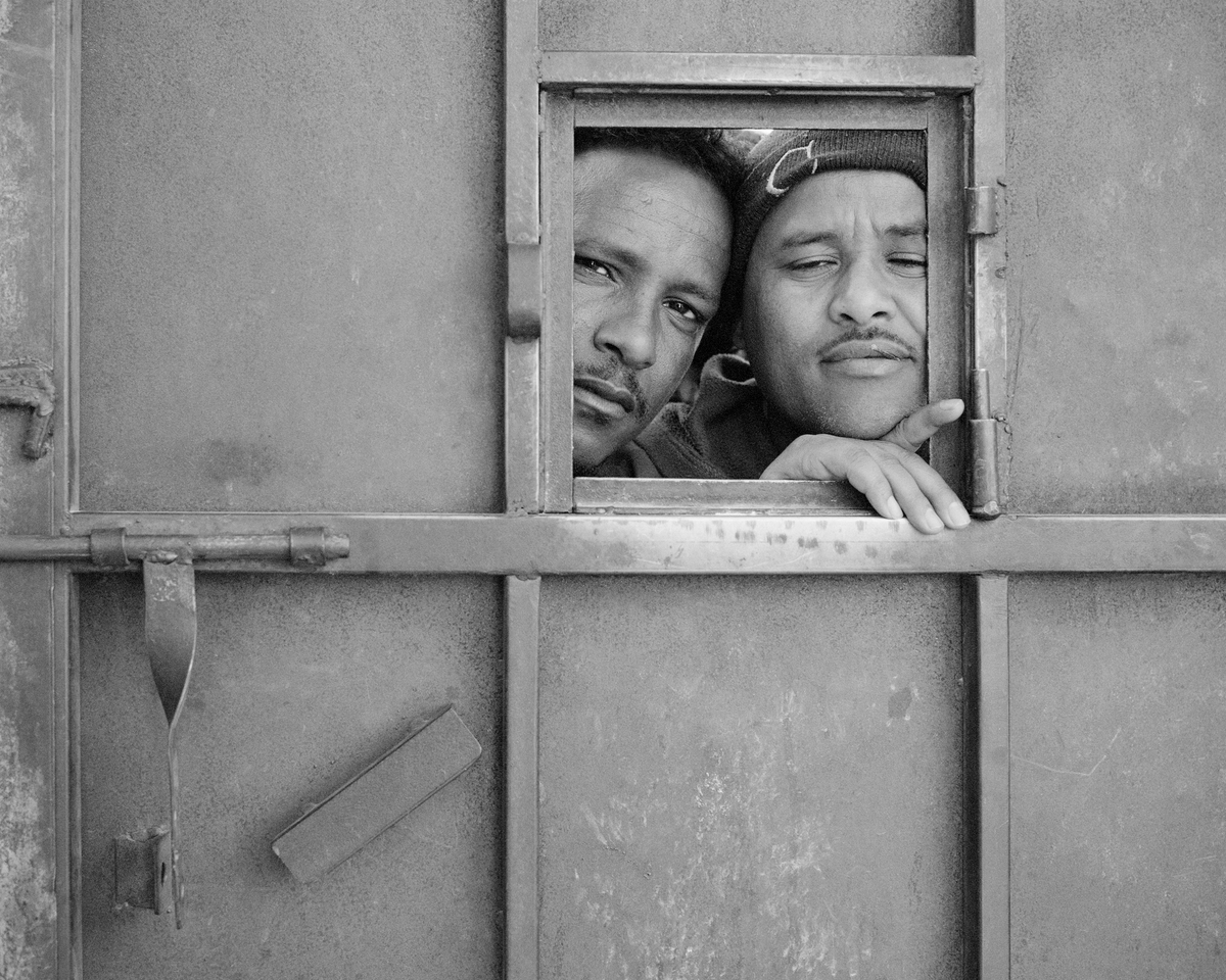 14 décembre 2019, centre de détention de Dar el-Jebel, portrait de détenus derrière la porte du bloc 1, où vivent environ 170 personnes venant majoritairement d'Érythrée.
