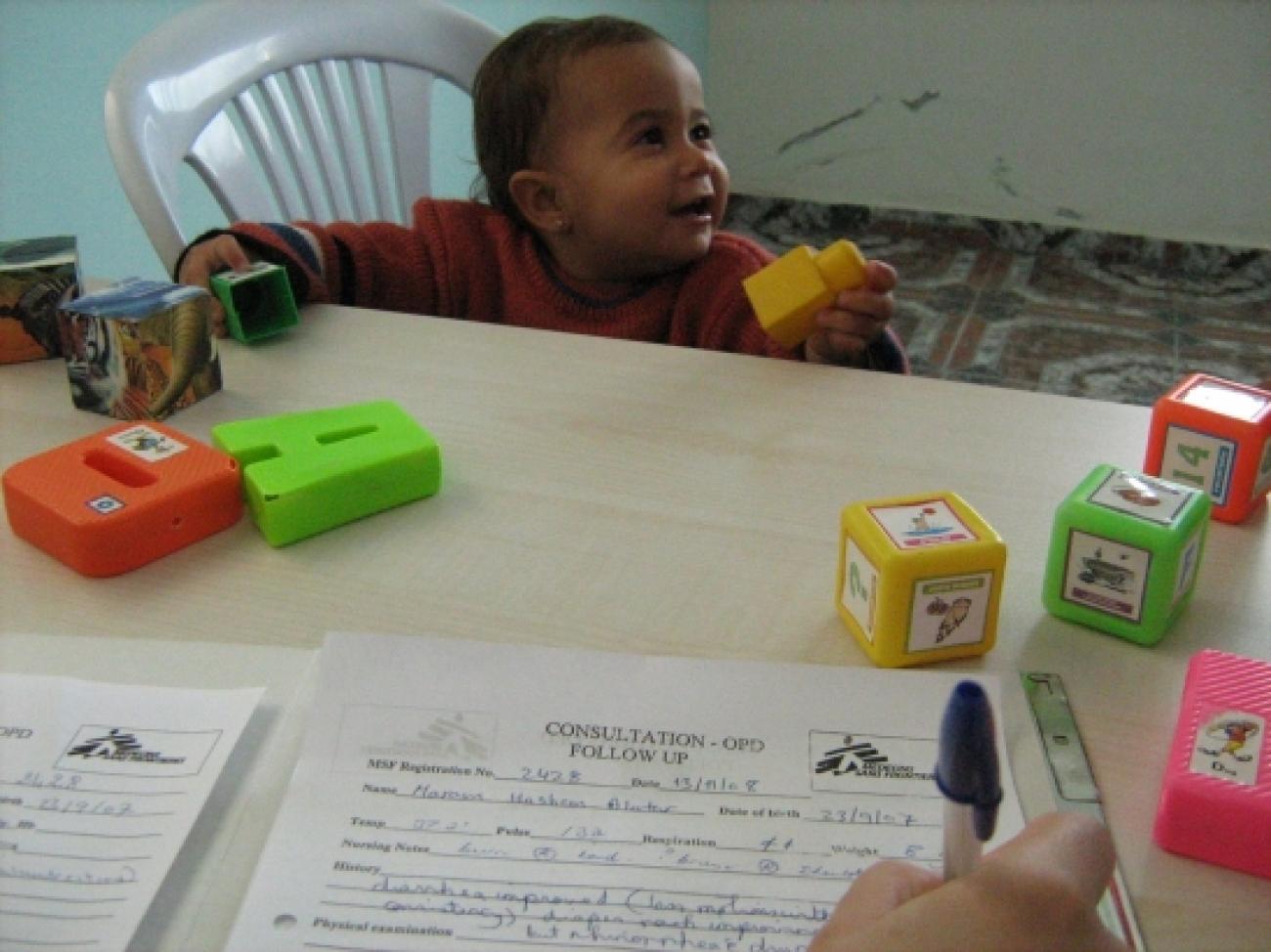 L'examen clinique montre que Fatima est en bonne santé. Elle n'a pas d'otite, ni d'inflammations. Trois médecins assurent en permanence le suivi des enfants dans la consultation MSF. Ce jour là, 60 enfants se seront déplacés pour demander un avis médical.