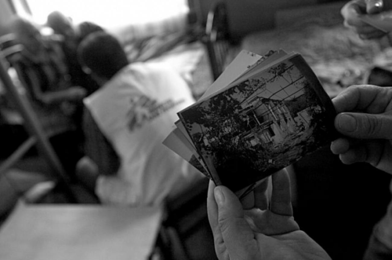 Ci dessus : Des personnes déplacées montrent ce qu'il reste de leur maison au cours d'une consultation avec le psychologue MSF.
