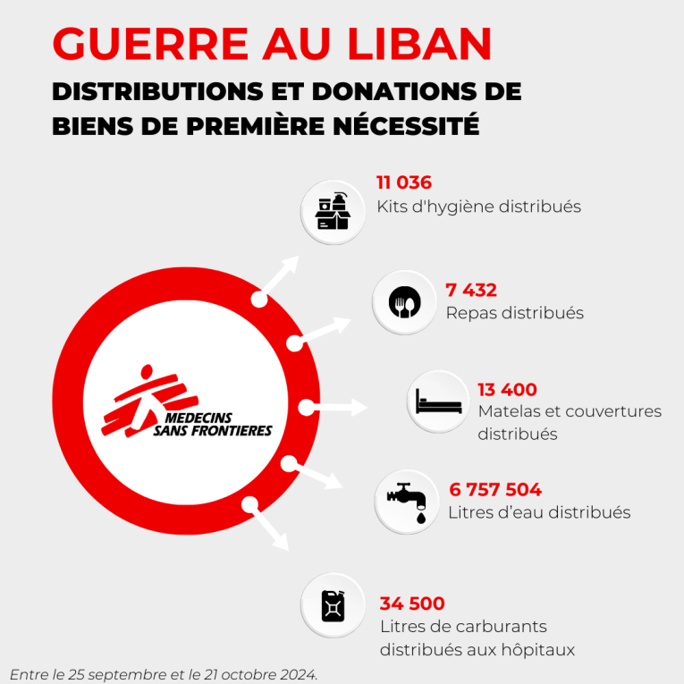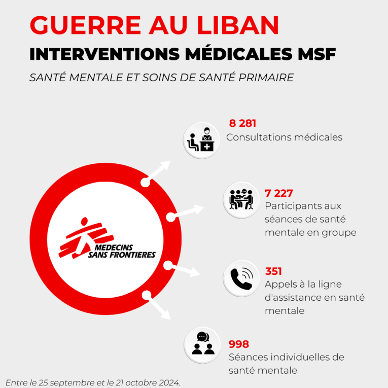 MSF a déployé des équipes médicales dans différents gouvernorats du pays : Beyrouth, le Mont-Liban, le Sud (Saïda), le Nord (Tripoli), la Bekaa et l’Akkar, offrant des premiers secours psychologiques, des consultations médicales, des médicaments et des consultations de santé mentale. Près de 500 membres des équipes MSF travaillent au Liban.