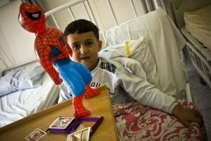 Quelques jours après l'opération, Waël reprend un peu ses forces et joue dans sa chambre où Maryvonne, la psychiatre de MSF, est venue lui rendre visite.