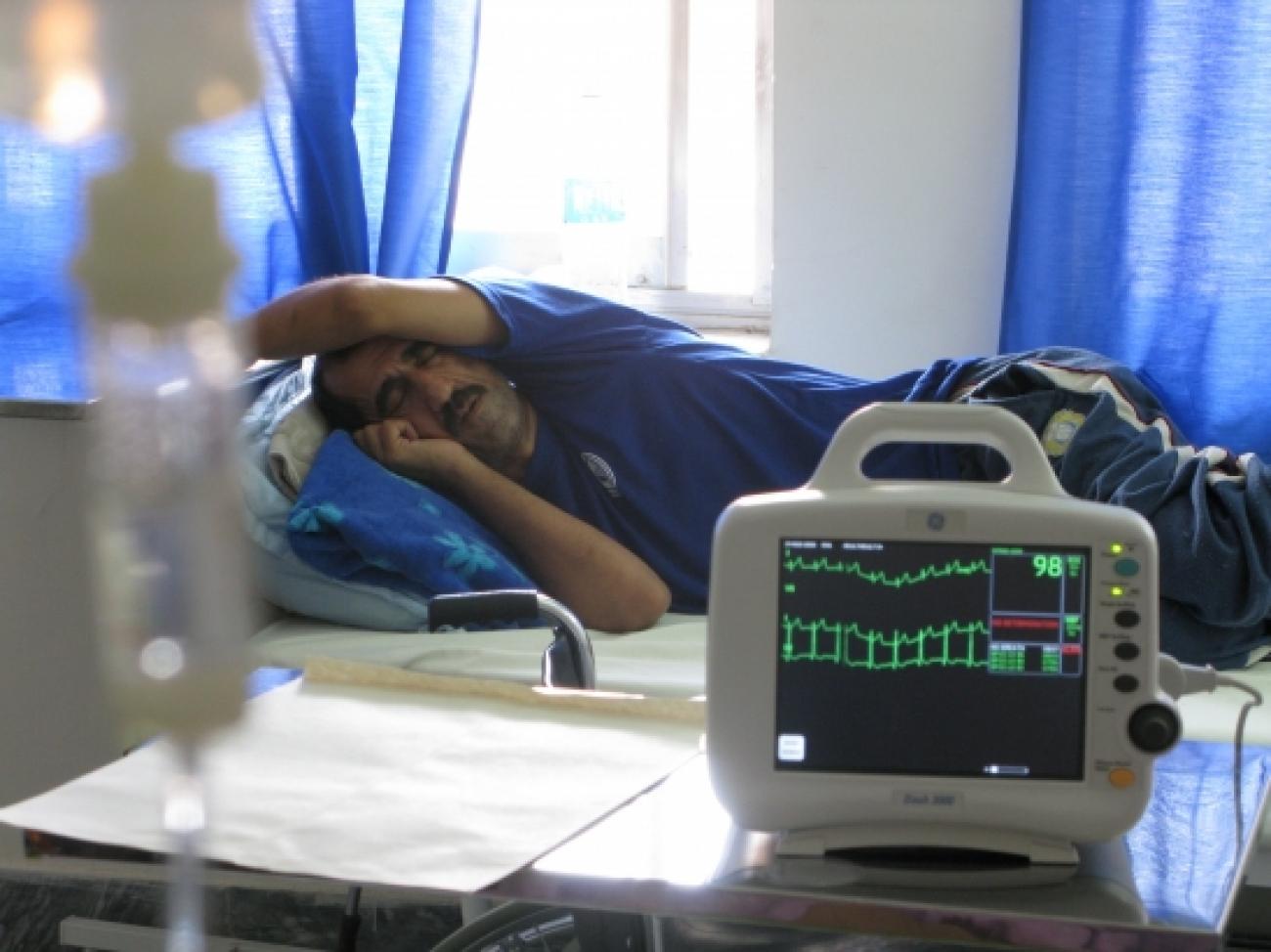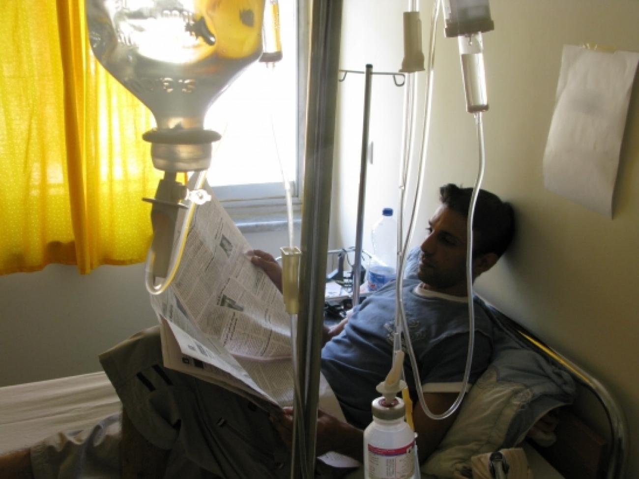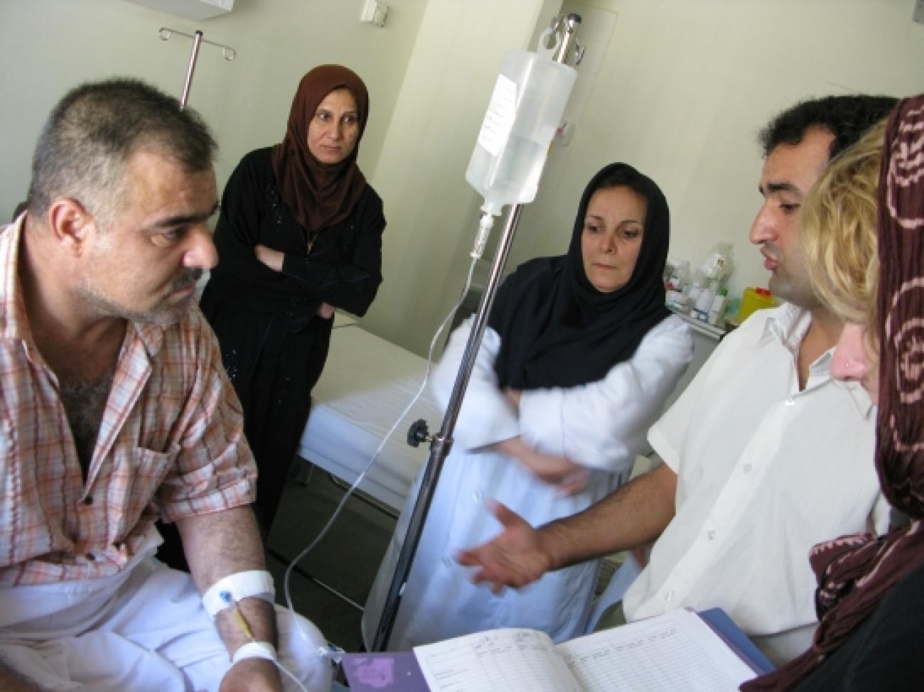 @Siavash Maghsoudi. Ce patient vient de subir un prélèvement osseux afin de déterminer l'antibiotique approprié à son infection. Chaque jour, l'équipe médicale composée de médecins, d'infirmiers iraniens, internationaux et de traducteurs fait le tour de chaque patient et vérifient leur état de santé. Un plan opératoire est proposé en fonction du cas complexe de chaque patient.