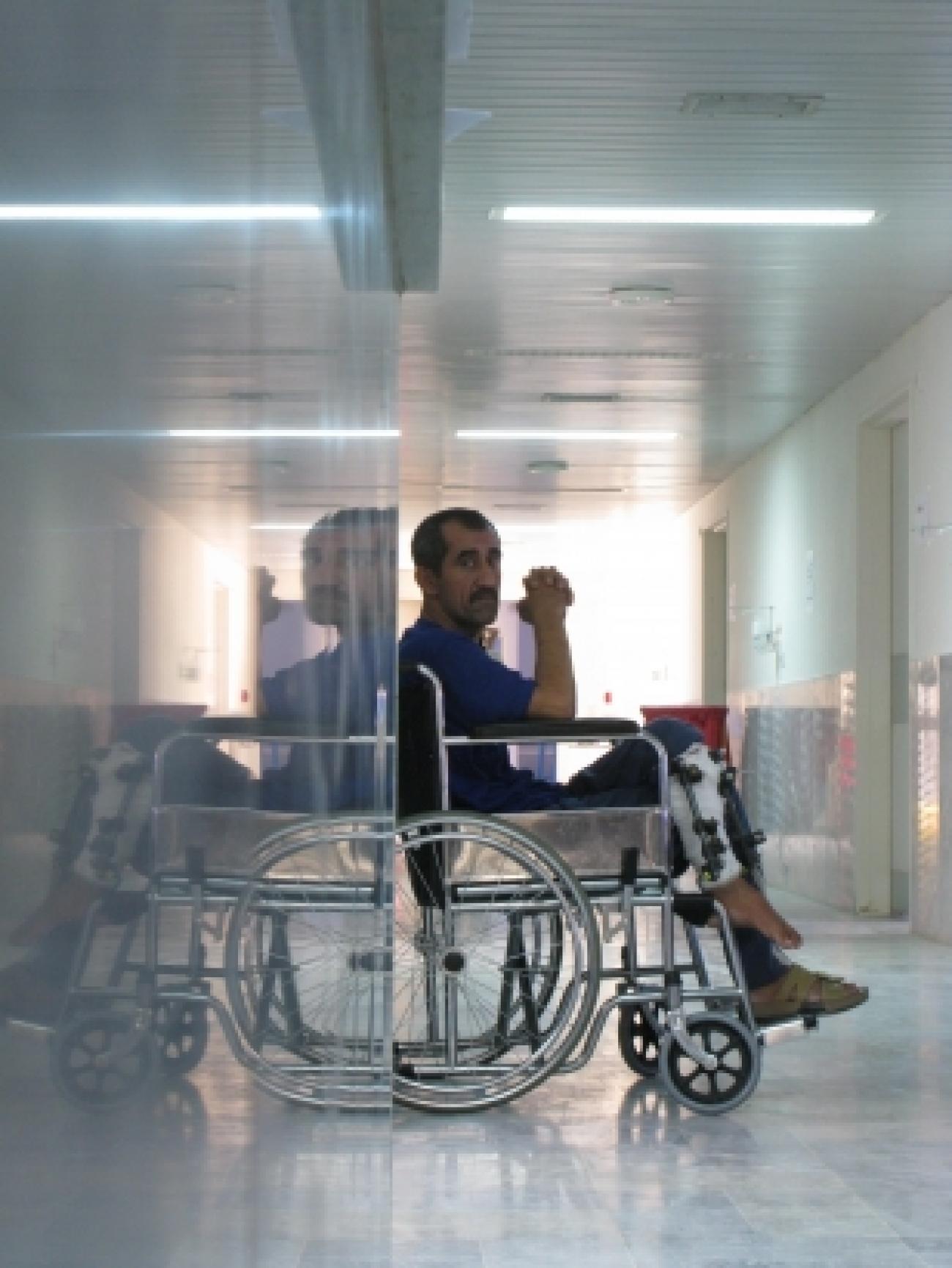 @Siavash Maghsoudi. "J'étais au volant de mon taxi à Bagdad quand j'ai entendu une énorme explosion. Tout a volé en éclats. Ma voiture a été prise dans un carambolage. J'ai été transporté dans un hôpital puis un autre, j'ai été soigné mais j'avais besoin d'être greffé. Je faisais partie du premier groupe de patients quand l'hôpital MSF a été ouvert en Iran. J'avais une grosse infection osseuse. Mon infection a été traitée ici. Je suis rentré chez moi avec mon traitement antibiotique. Je suis revenu 47 jours plus tard. Les prélèvements sont pour l'instant négatifs". Ghaleb, chauffeur de taxi, 43 ans.