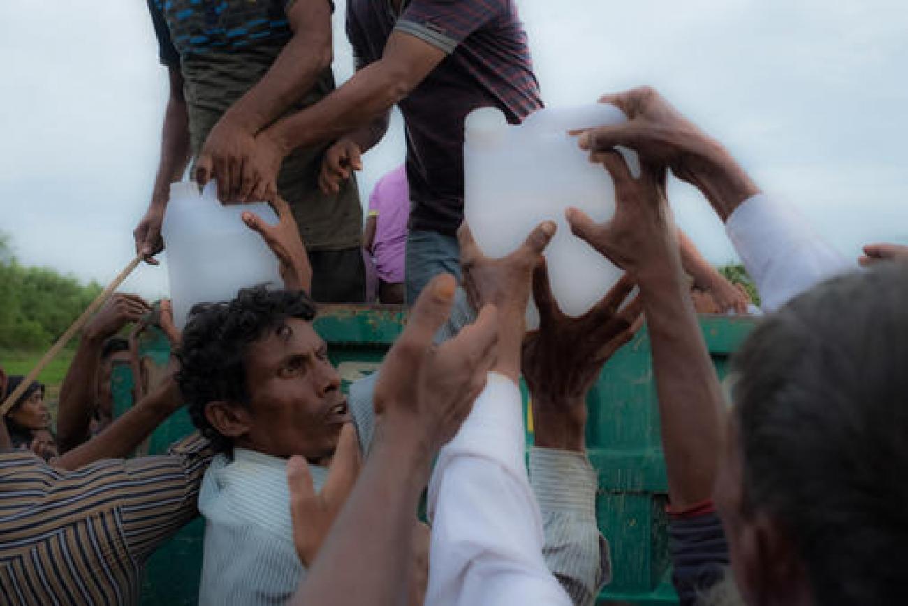 Distribution d'eau par Action Contre la Faim à Thangkhali. Faute d'eau potable, les gens boivent l'eau collectée dans les rizières, les flaques, ou de petits puits creusés à la main et souvent contaminés par des excréments.