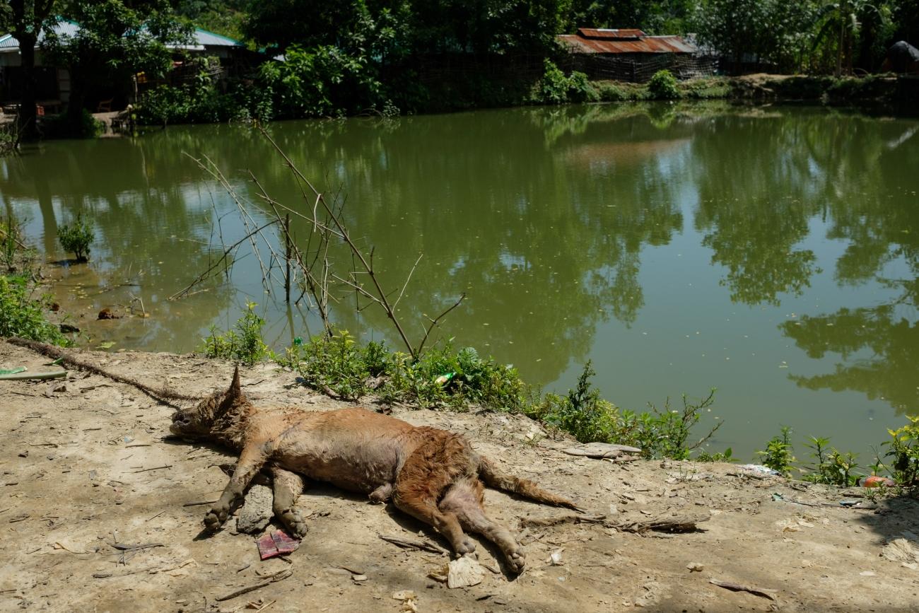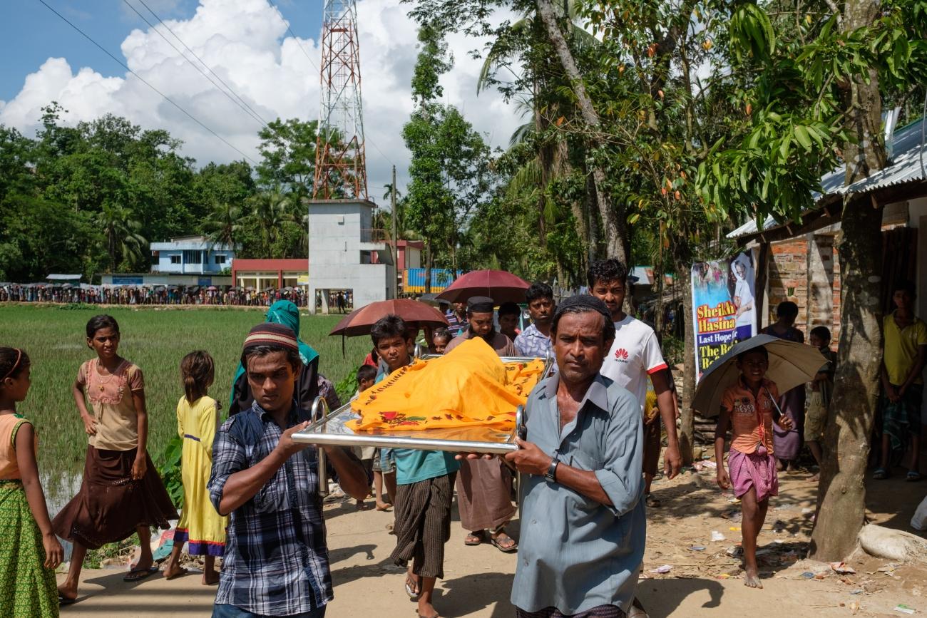 « J’y ai retrouvé quatre femmes de mon village ; elles aussi étaient blessées et saignaient. Ensemble, nous avons marché trois jours avant de monter à bord d’un bateau pour le Bangladesh. Je ne me souviens pas exactement de la date, tout est si flou. J’ai perdu mes six enfants ; trois filles et trois garçons. Le plus jeune avait seulement trois mois. Lorsque j’ai fui, j’ai emporté un bébé de la même taille que le mien. Je croyais que c’était le mien. Mais à un moment, je me suis rendu compte que ce n’était pas mon enfant, que c’était un autre bébé, mort. Il avait été éventré.
