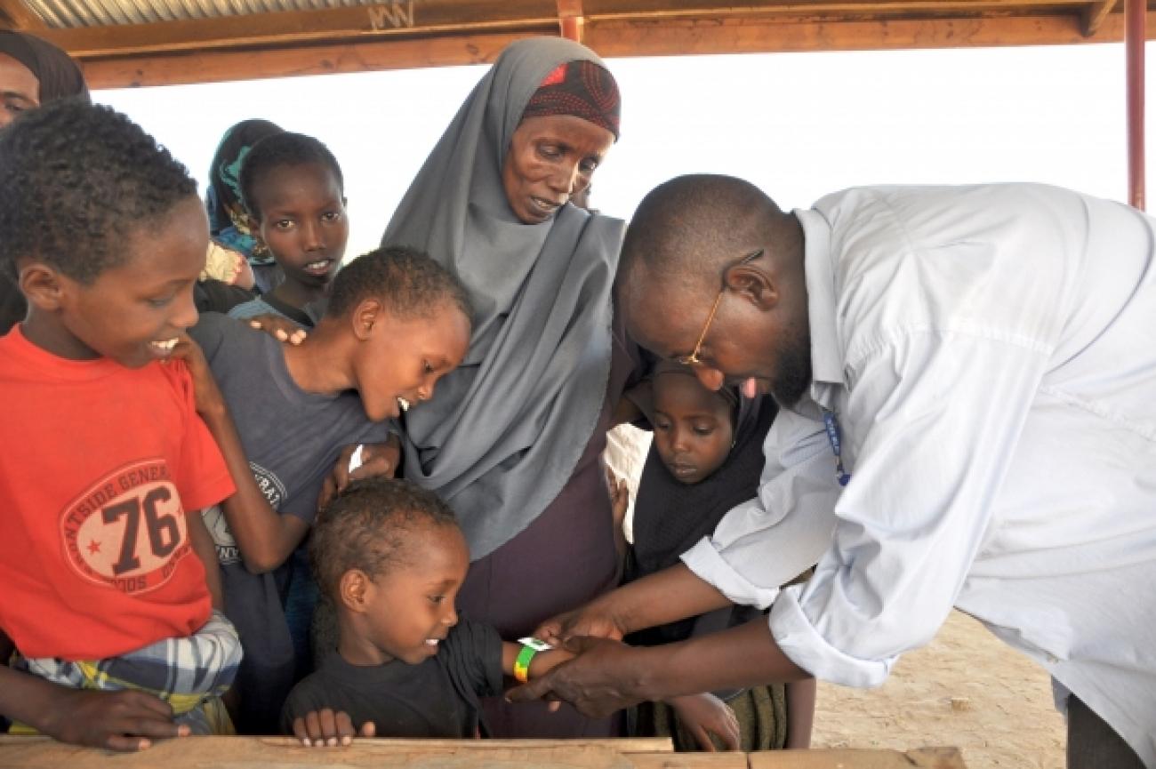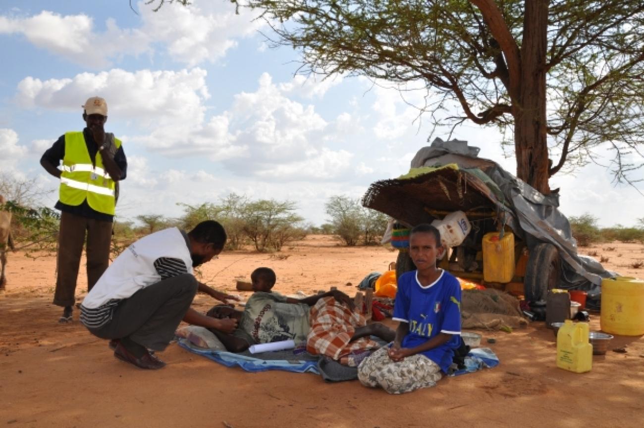 Un bébé est ausculté pour vérifier qu’il ne souffre pas de malnutrition, un état fréquent chez les enfants de moins de 5 ans qui résulte de la sécheresse en Somalie, de l’harassant voyage des réfugiés ainsi que de la longue attente de distribution de nourriture une fois arrivés dans les camps.