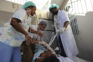 Les unités chirurgicales mises en place par MSF à Port-au-Prince continuent de fonctionner non-stop afin de prendre en charge l'important nombre de personnes blessées suite au séisme. La priorité étant donnée aux cas les plus urgents, les équipes ont pratiqué des césariennes et des amputations. Le personnel médical expérimenté MSF dit ne jamais avoir vu autant de blessures aussi graves.