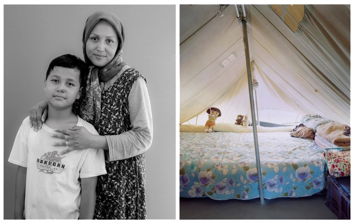 Ces photographies montrent des intérieurs de tentes, de cabanes ou de chambres dans les camps de réfugiés, les campements ou les centres d’accueil. Chaque intérieur est associé au portrait et au témoignage de ses habitants.