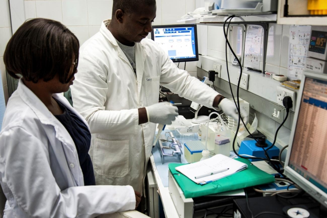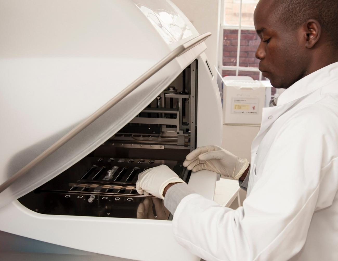 Le technicien de laboratoire au centre de santé de Namitambo utilise la machine SAMBA pour tester la charge virale des patients. Installée sur le lieu même des soins, SAMBA permet d’obtenir le résultat du test dans la journée, et d'éviter de devoir conserver les échantillons de sang au frigo. Elle est équipée de batteries en cas de coupures électriques, fréquentes dans de nombreux pays.