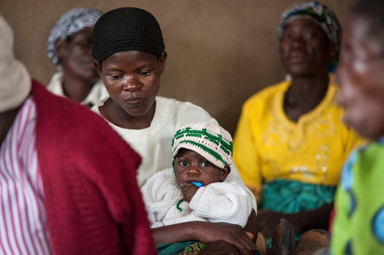 Une femme et son enfant dans un groupe de soutien à Chidothe. Selon un modèle développé par MSF au Mozambique, les membres du groupe vont chercher chaque mois à tour de rôle les ARV dont ils ont besoin dans une clinique à 8km de là. Quand le chef de village a demandé combien de personnes dans le groupe avaient été testées récemment pour leur charge virale, presque tout le monde a levé la main.