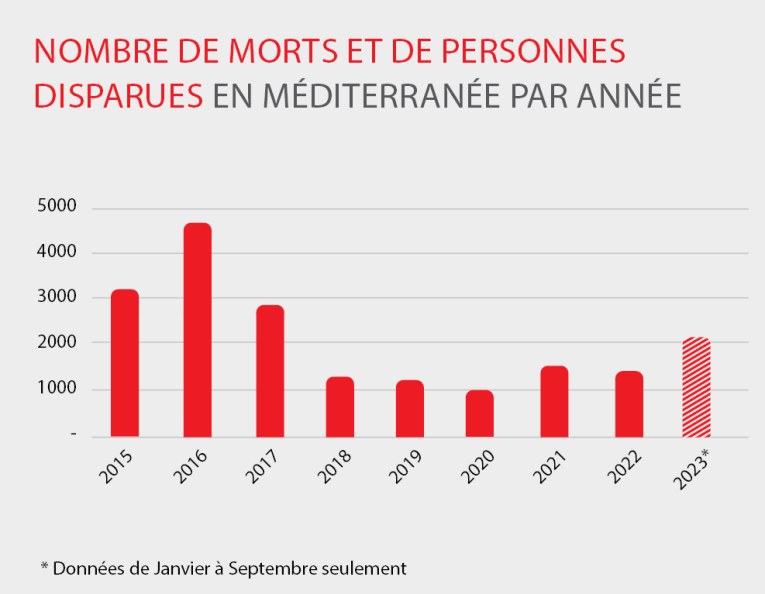 Les personnes secourues par MSF se trouvent à bord d'embarcations extrêmement précaires et dangereuses, souvent aux prises avec de mauvaises conditions météorologiques, expliquant que prendre la mer était la seule option qu’elles avaient. L'embarquement pour ce voyage périlleux et trop souvent mortel, se fait souvent depuis la Libye et, depuis mars 2023, de plus en plus depuis la Tunisie, avec environ 90 000 départs recensés par le UNHCR.