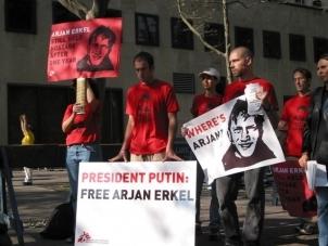 Après avoir lu les noms des dix travailleurs humanitaires kidnappés dans le Caucase depuis 1999, les manifestants sont montés à bord d'un bateau qui, bardé de banderoles appelant à la libération d'Arjan, a croisé au large, devant le siège des Nations unies où le président russe déjeunait avec ses collègues.