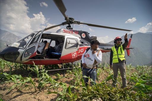 Dans les régions montagneuses, les habitants de villages reculés n’ont pratiquement reçu aucune aide. Simplement les blessés ont été transférés par l’armée pour être soignés dans des hôpitaux. Beaucoup de routes sont coupées et l’hélicoptère est le seul moyen d’accéder à ces villages en altitude. Le 21 mai, une équipe logistique s’est posée dans un village de la région d’Arughat pour distribuer des kits d’hygiène (seau, savon, serviettes, lessive). Elle est accompagnée d’une équipe médicale qui va pouvoir donner des consultations. L’hélicoptère a dû faire plusieurs rotations pour acheminer les kits d’hygiène. Les deux équipes vont ainsi aller dans différents villages reculés. Et l’opération recommencera la semaine prochaine pour la distribution de tentes, de couvertures et de jerrycans. Car dans cette zone, 80 à 100% des maisons ont été détruites. Les gens dorment dehors et ils ont besoin d’abris. C’est assez urgent, la mousson va bientôt commencer.