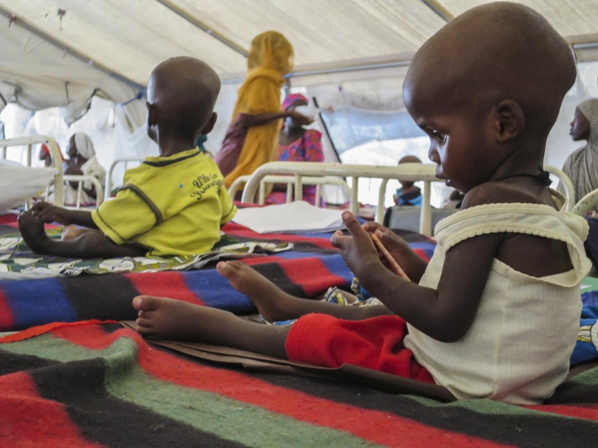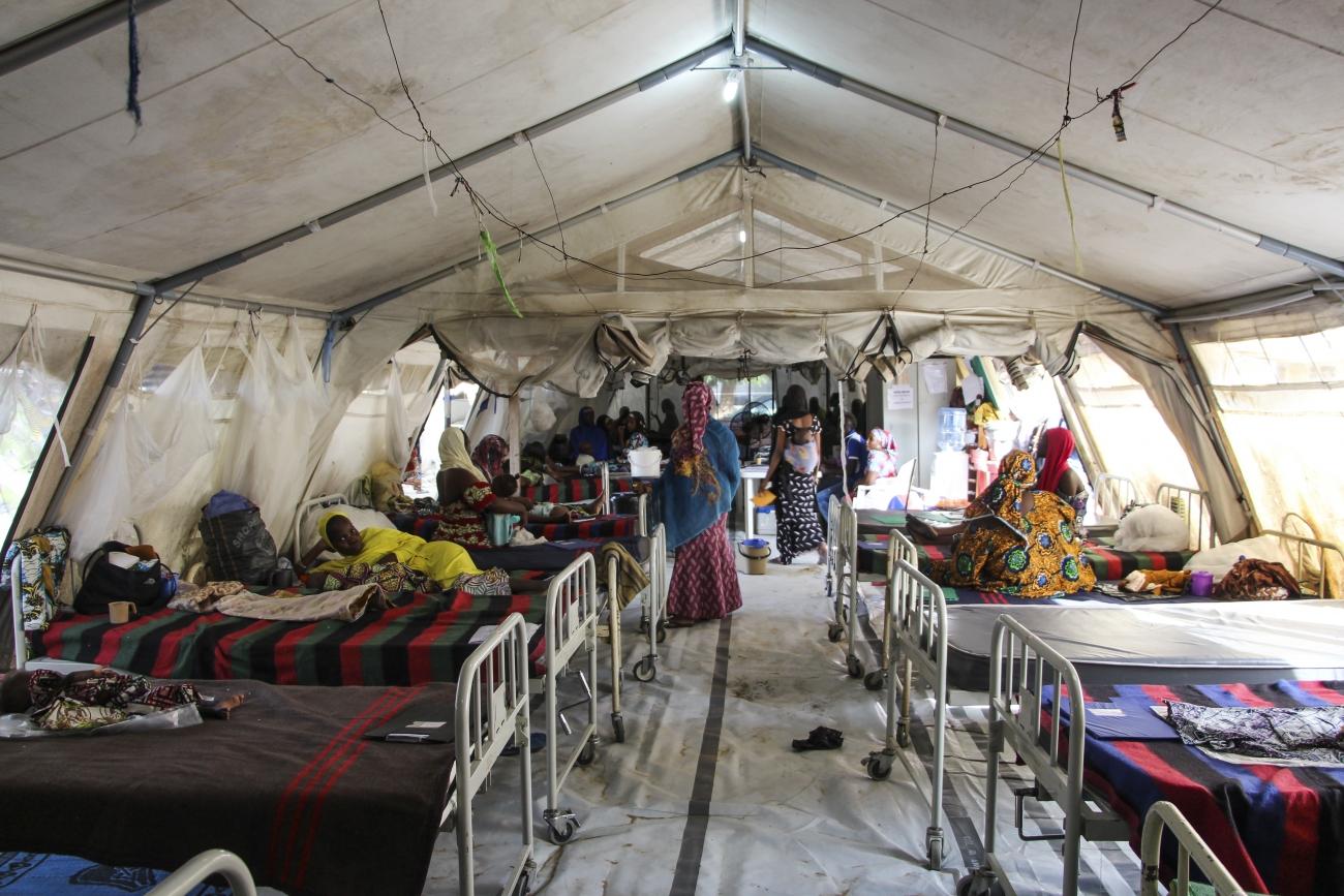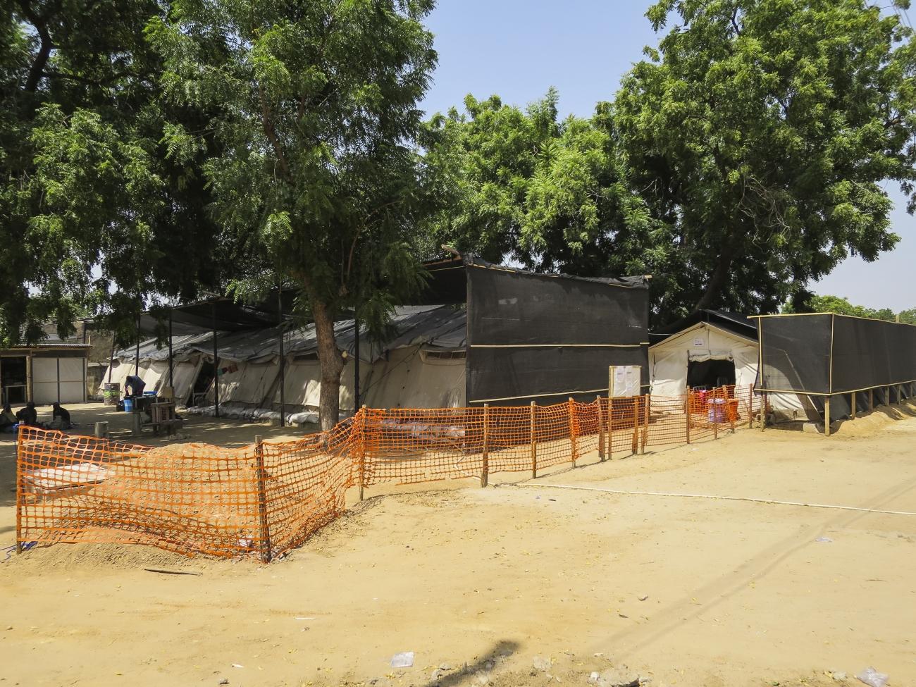 « Notre centre nutritionnel thérapeutique est entièrement sous tentes. Il est situé sur le terrain du centre de santé de Gwange. Au départ il avait une capacité de 110 lits, et l’unité de soins intensifs était dans le bâtiment du centre de soins, mais maintenant il y a 102 lits à cause des travaux de rénovation en cours dans le bâtiment. »
