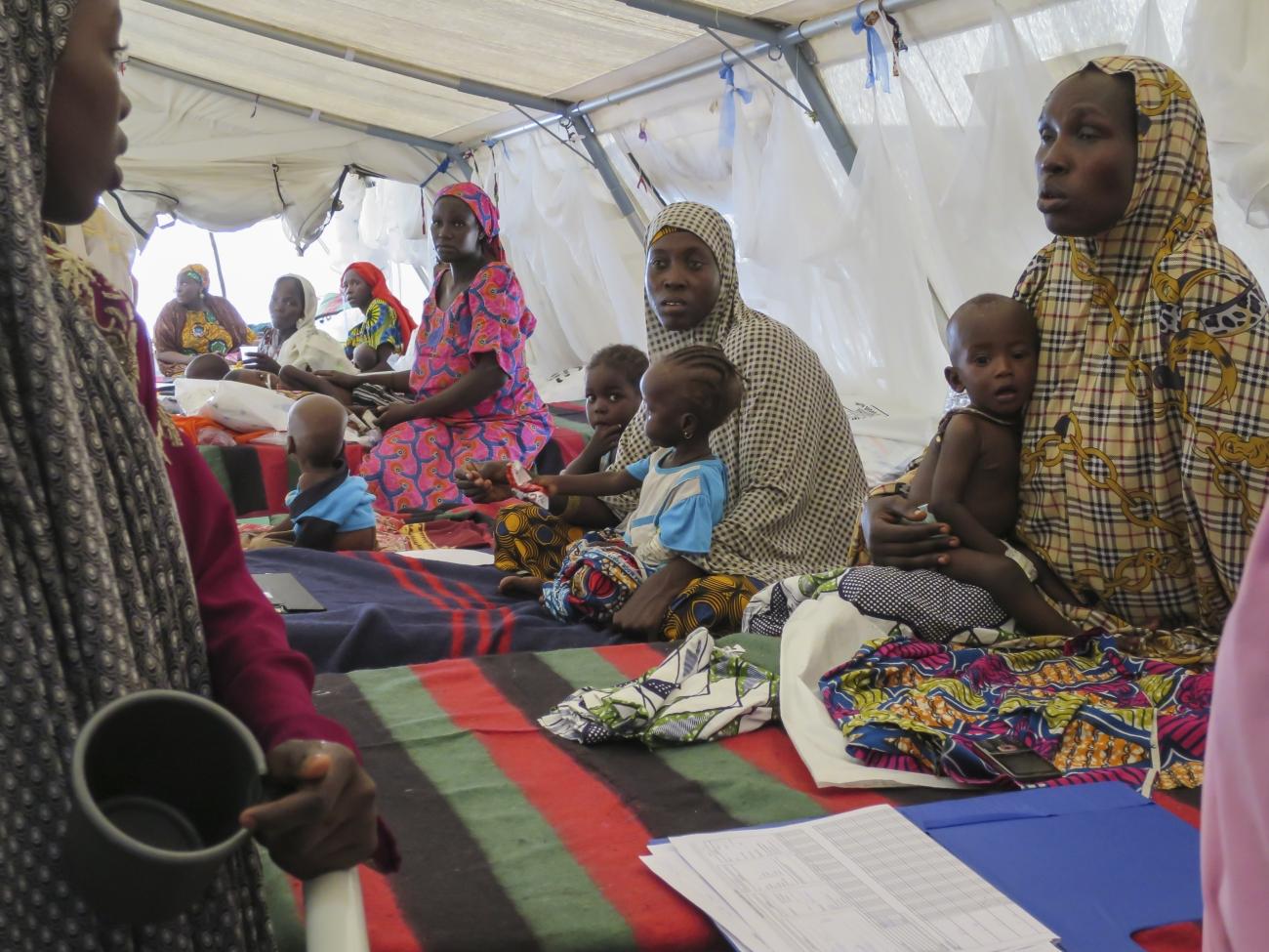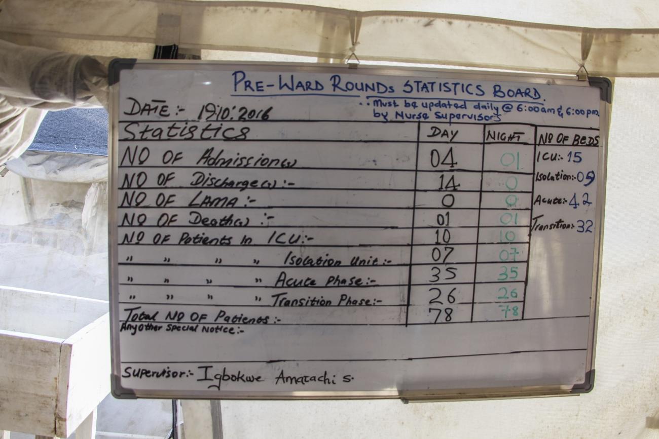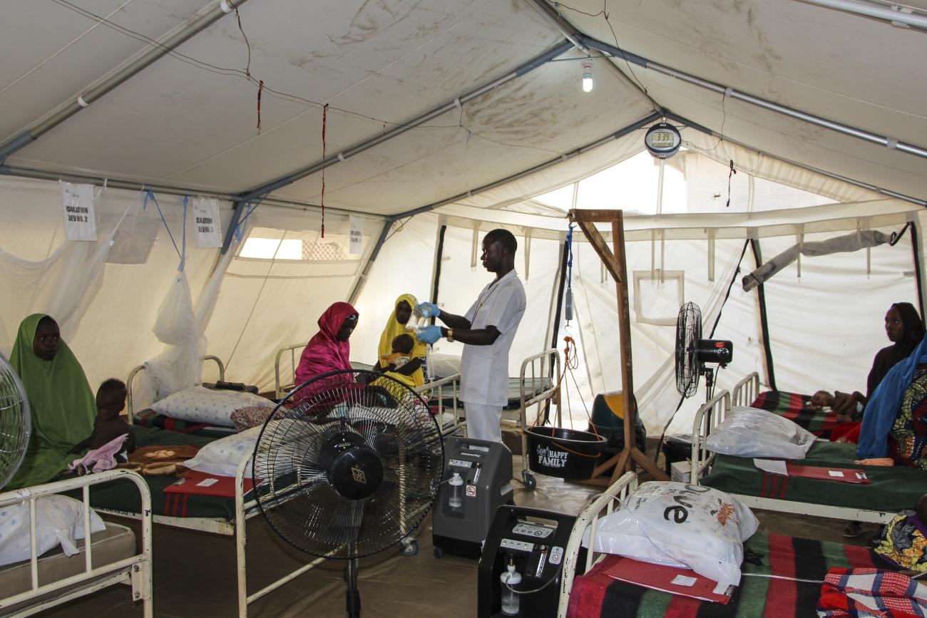 « Notre centre nutritionnel thérapeutique est entièrement sous tentes. Il est situé sur le terrain du centre de santé de Gwange. Au départ il avait une capacité de 110 lits, et l’unité de soins intensifs était dans le bâtiment du centre de soins, mais maintenant il y a 102 lits à cause des travaux de rénovation en cours dans le bâtiment. »