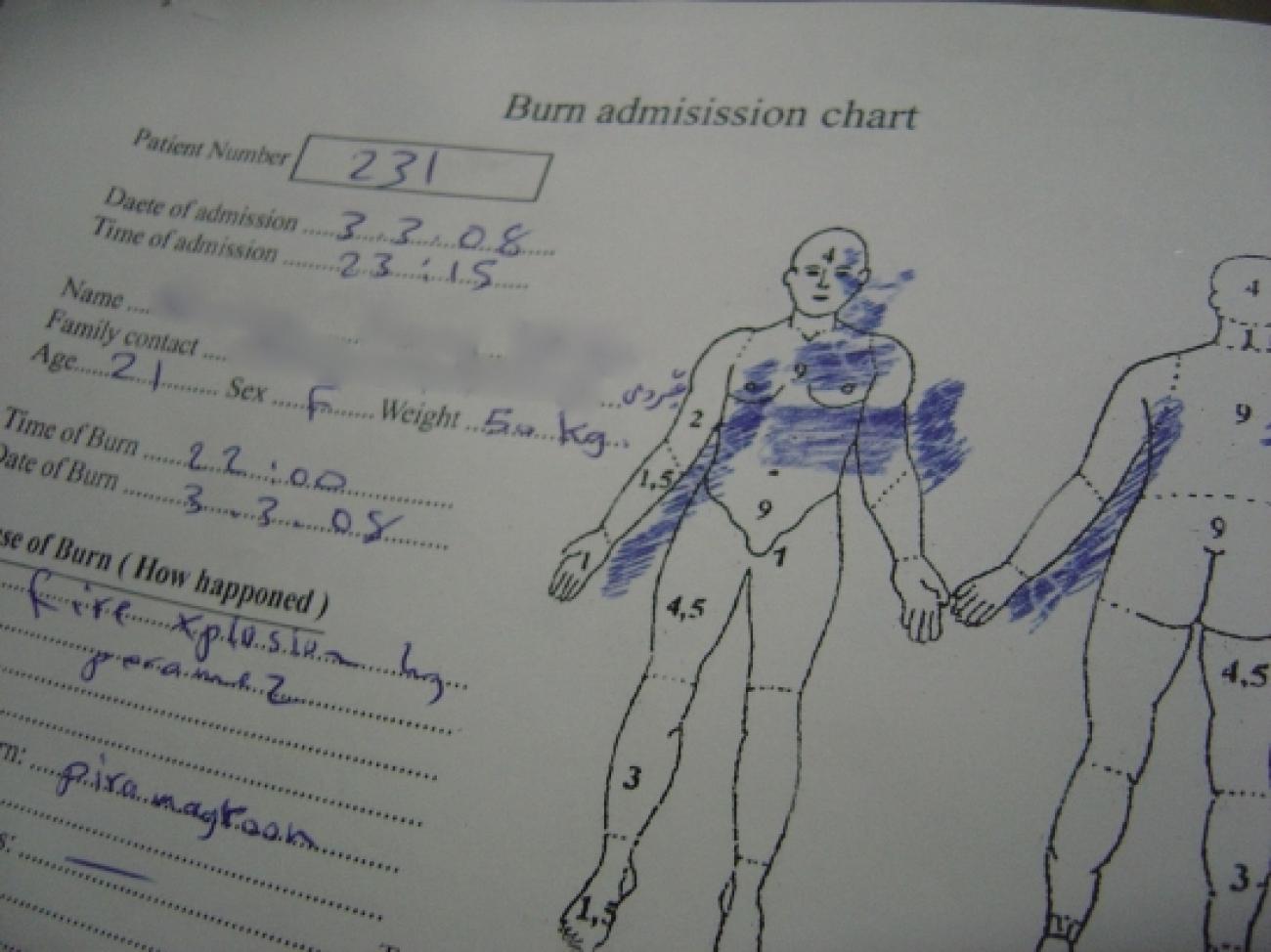 La plupart des blessés ont été brûlés par des explosions de gaz accidentelles ou l'inflammation de fluides. Les enfants se brûlent souvent avec de l'eau chaude. Les chauffages au kérosène ou au gaz sont très répandus dans la région pour se chauffer et s'éclairer.