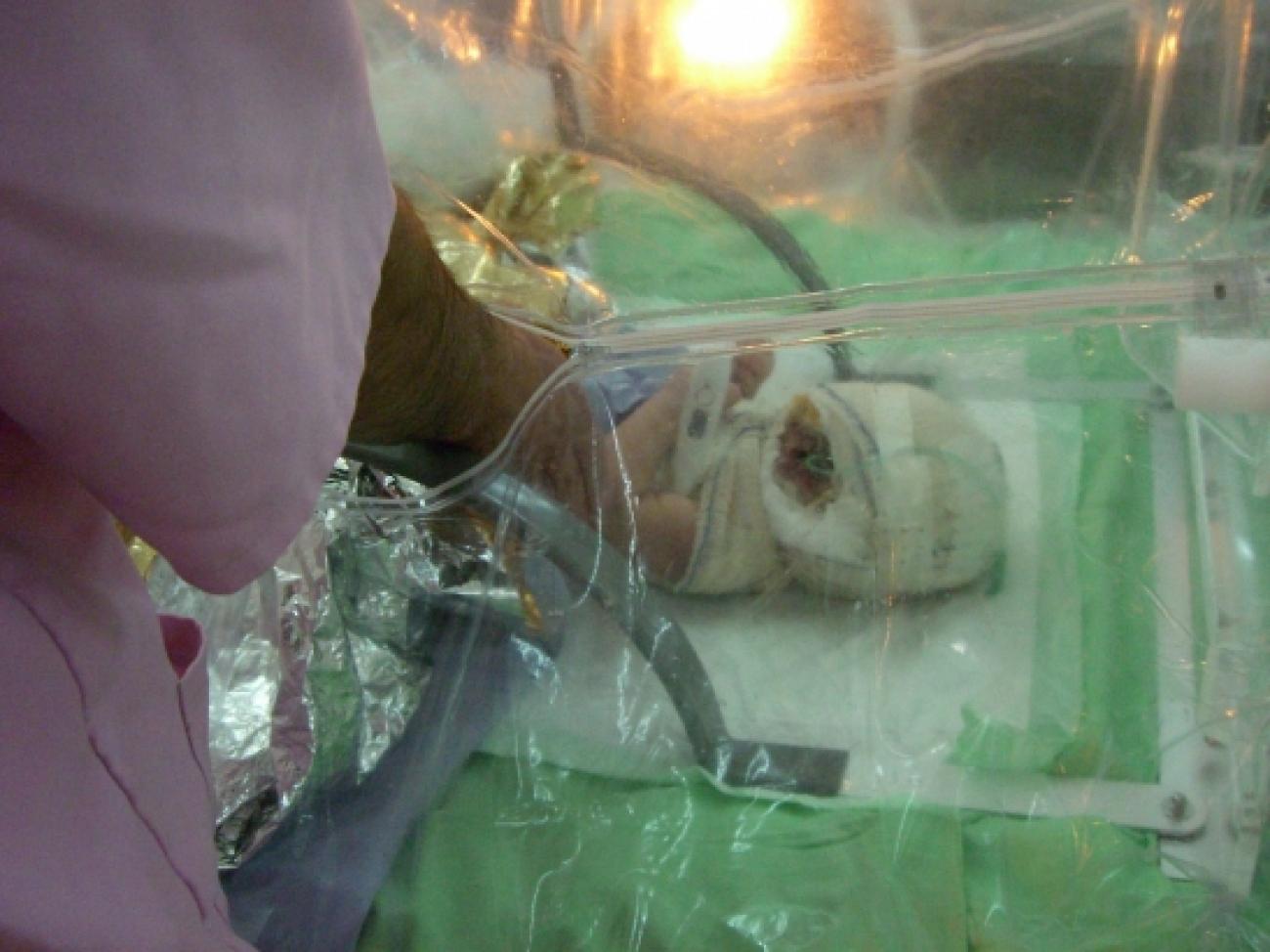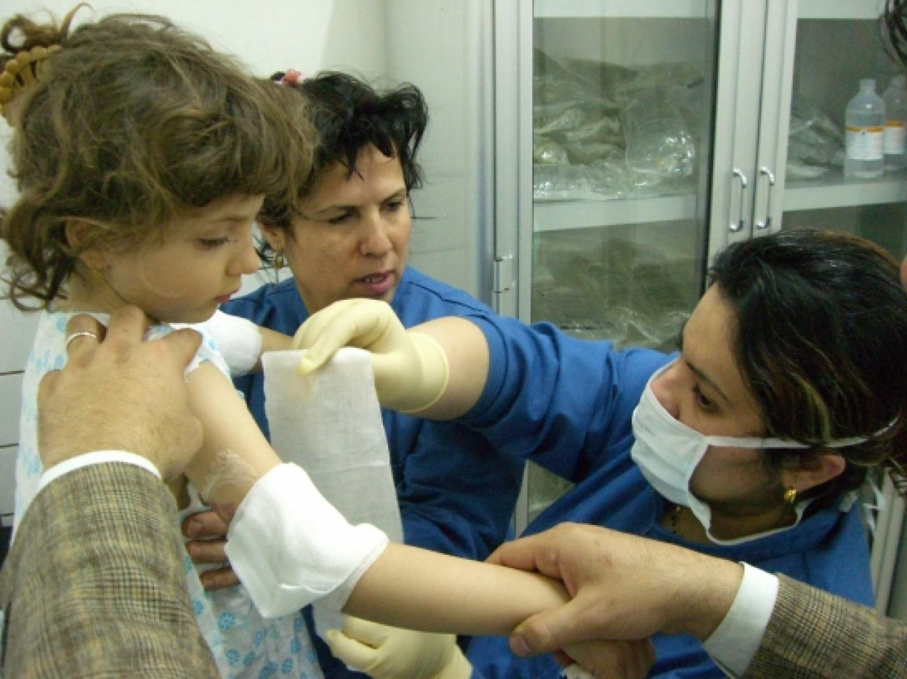 Cette petite fille a été brûlée par de l'eau chaude il y a quelques heures. La plaie vient d'être nettoyée, les infirmières posent maintenant une gaze stérile.