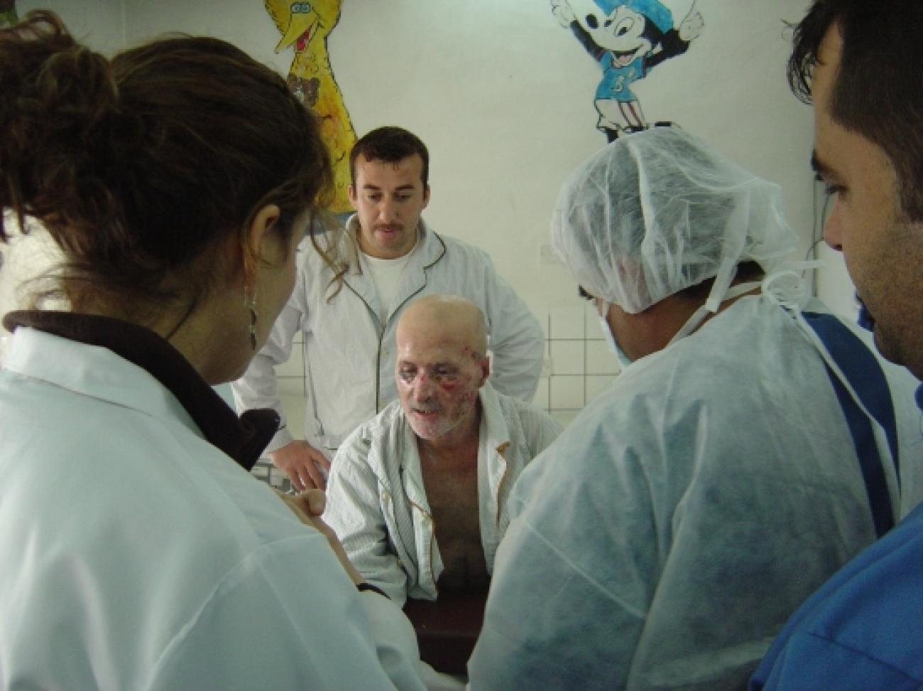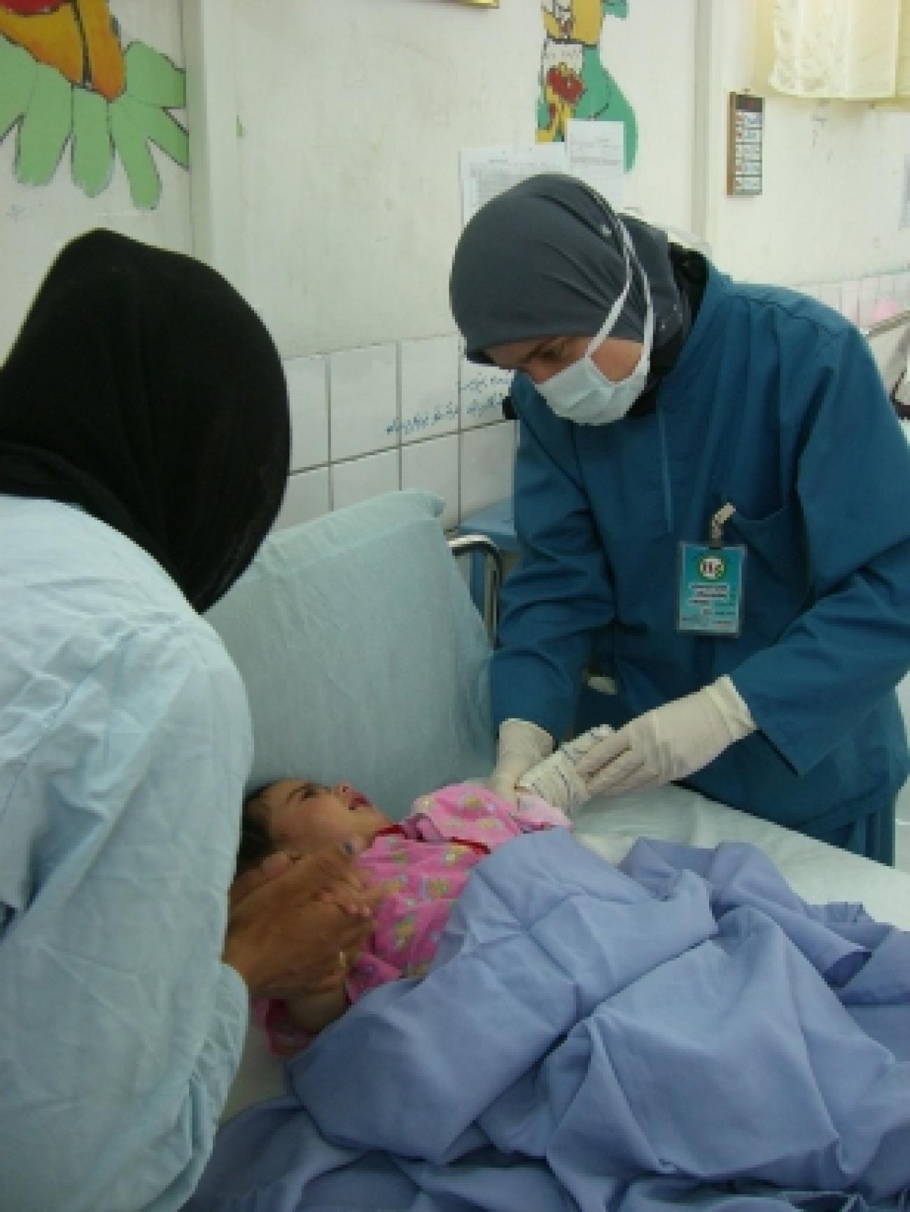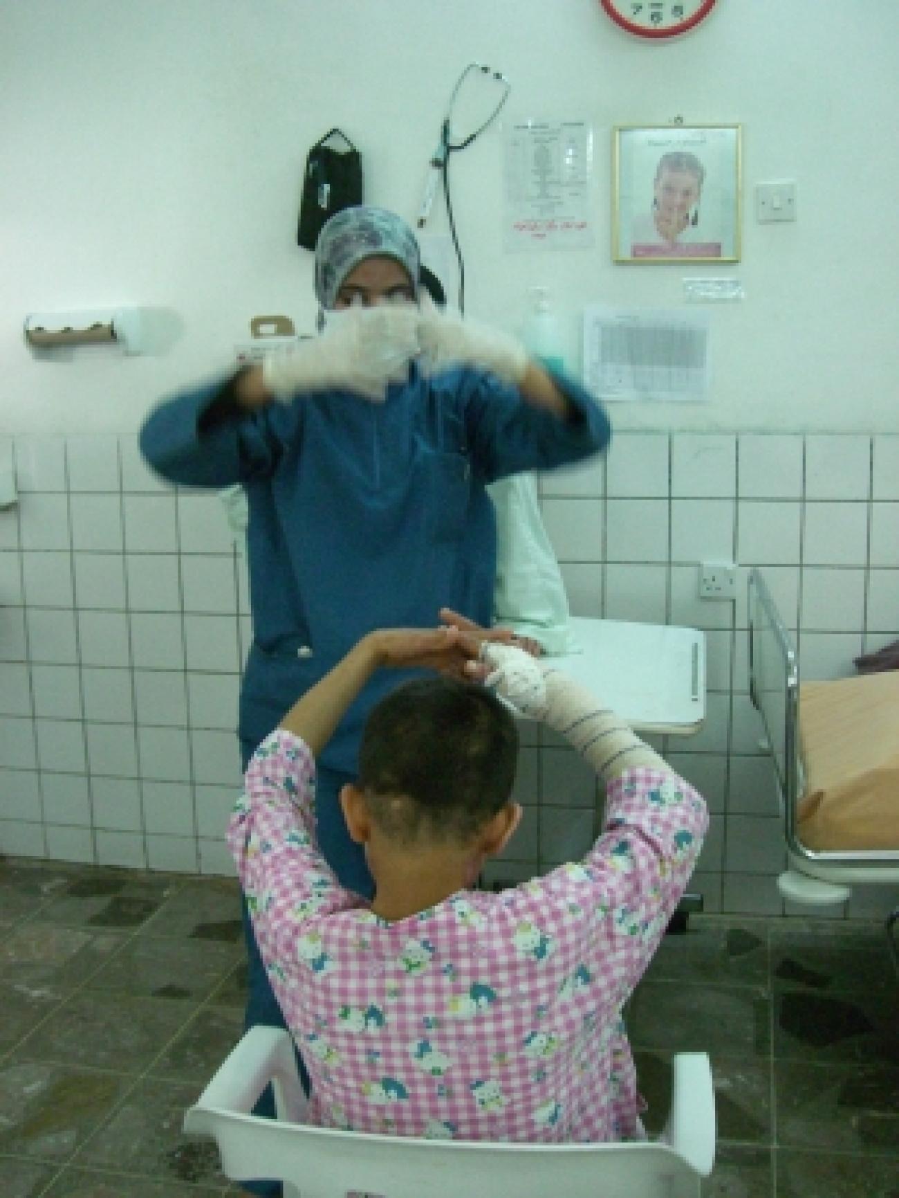 Les grands brûlés nécessitent une attention particulière de l'équipe soignante et de l'accompagnant. Le risque d'infection reste une constante. Hassan a été blessé par l'explosion d'une bouteille de gaz. Quotidiennement, ses pansements sont refaits et des soins de kinésithérapie lui sont prodigués. Il recommence à prendre du poids. Son corps réapprend à lutter contre les infections.