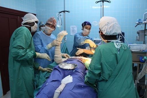 Au premier étage, on pousse la porte du bloc opératoire : un chirurgien, un anesthésiste, un infirmier de bloc s’affairent. Un jeune homme de 30 ans est sur la table d’opération, amputé d’une jambe. « C’est un patient qui a eu une plaie par balle, qui saignait au niveau de la cuisse. Comme il habitait en dehors de Bangui, les gens lui ont fait un garrot, qu’il a gardé 7 heures, le temps d’arriver. Pendant tout ce temps, sa jambe n’a pas été vascularisée. On a ouvert sa cuisse pour parer la plaie et ligaturer la veine qui saignait. Mais dans les suites opératoires, du fait du garrot, sa jambe s’est gangrenée. Il a fallu d’abord amputer la jambe, puis quelques jours après, au niveau de la cuisse », explique Joël Bost, chirurgien MSF.