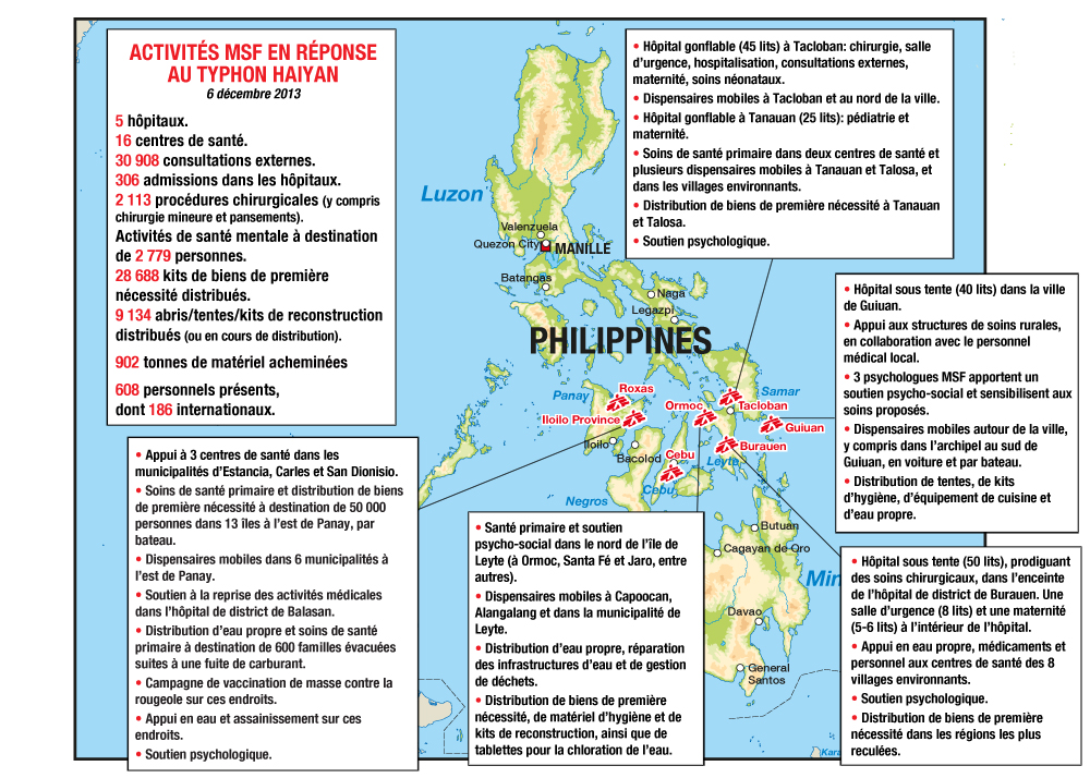 À Tacloban, de nombreuses organisations humanitaires sont présentes. Les quelques hôpitaux ouverts ont été gravement endommagés et travaillent sans relâche face à l'afflux de patients. Ils sont également confrontés à des pénuries d’électricité, le réseau de la ville étant encore hors service. MSF travaille ici pour élargir l'offre de soins secondaires et chirurgicaux. Dans d’autres centres urbains comme Guiuan et Burauen, MSF est l’une des rares organisations prodiguant des soins médicaux. Enfin dans certaines zones rurales et côtières, comme sur la côté et les îles à l'est de Panay, le nord de Leyte ou la côte orientale de Samar, les dispensaires mobiles installés par MSF atteignent des villages qui n’ont toujours pas reçu de secours.