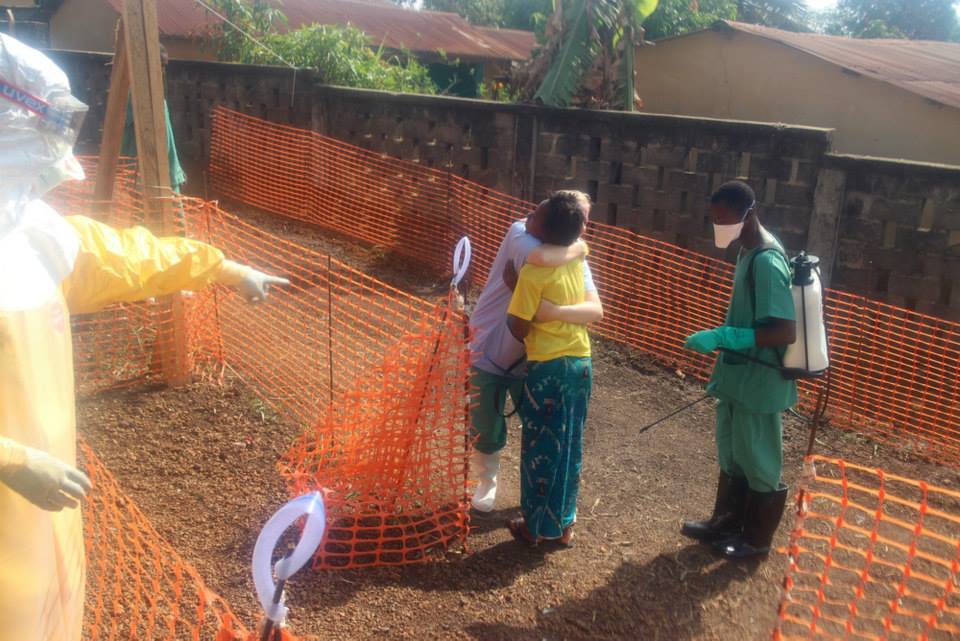 Après avoir passé plus de 10 jours en isolation, ne voyant les équipes MSF qu’avec leurs combinaisons jaunes, Rose est prise dans les bras par l’infirmière qui s’est occupée d’elle. C’est la première fois que l’équipe médicale peut toucher un patient sans protection, Rose n’est plus contagieuse.