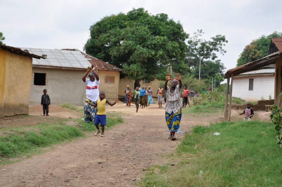 Rose est accompagnée de deux promoteurs de santé qui expliquent aux voisins et à la famille qu’elle n’est plus contagieuse et peut être touchée et embrassée sans risque.