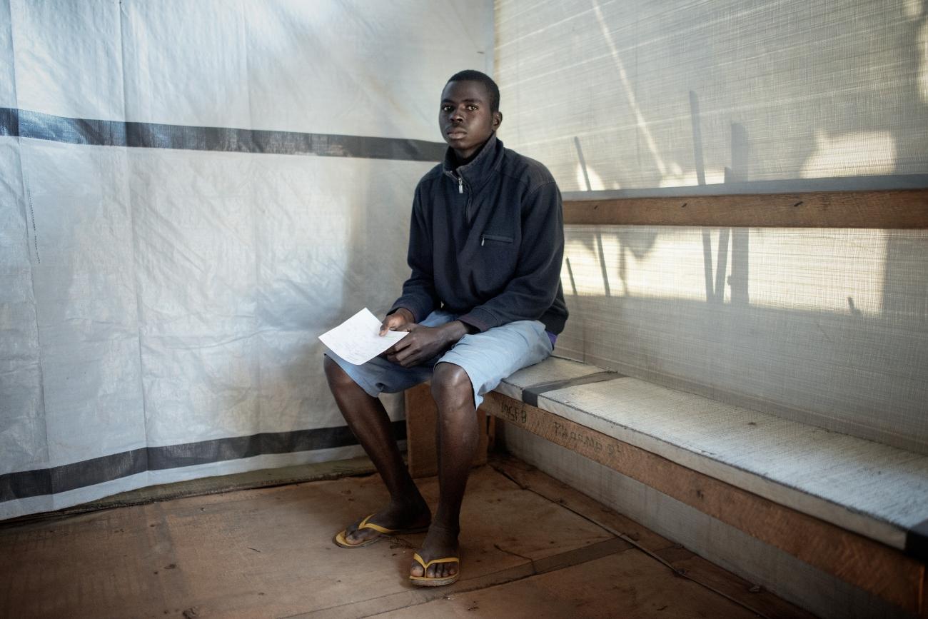 Stéphane Pani, 20 ans : « Lorsqu’il y a des coups de feu ou des grenades, je ne peux pas aller à l’école. » Il a fui son quartier il y a deux ans après qu’un groupe d’hommes a brûlé sa maison. Stéphane travaille parfois comme travailleur journalier au centre de soin de MSF à M’Poko. Il est la seule personne qui puisse soutenir financièrement les 5 membres de sa famille.