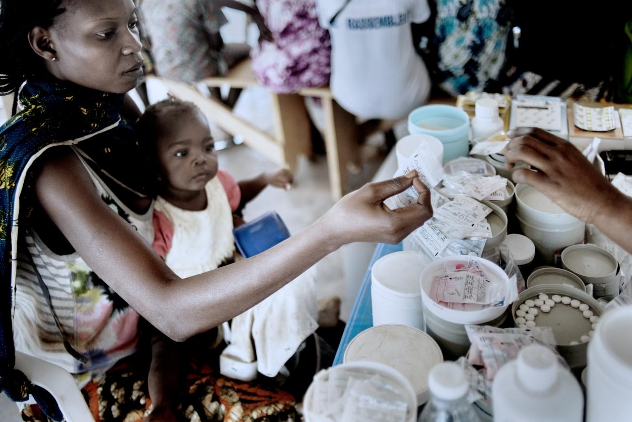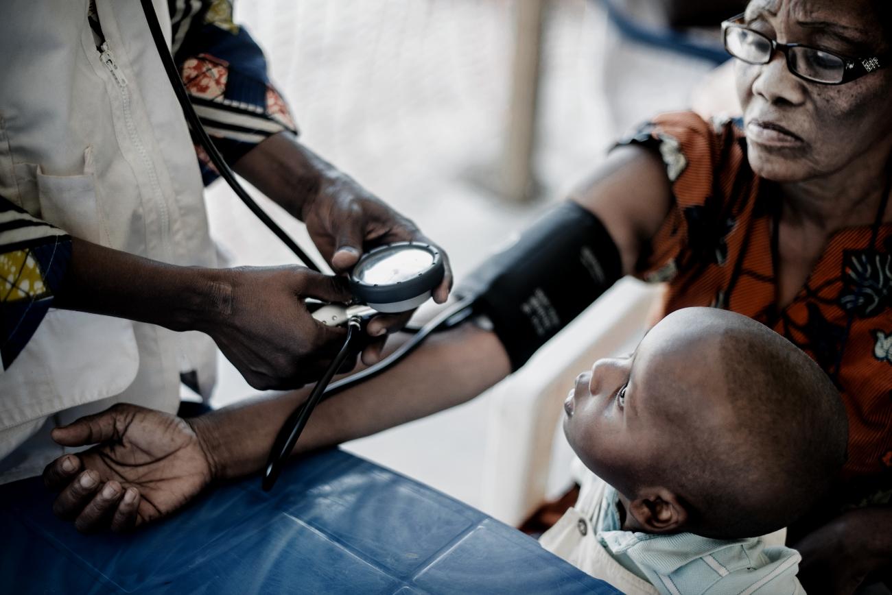 Une femme se fait prendre le poul au centre de santé de Médecins Sans Frontières (MSF) dans le camp de déplacés de Fateb, à Bangui.