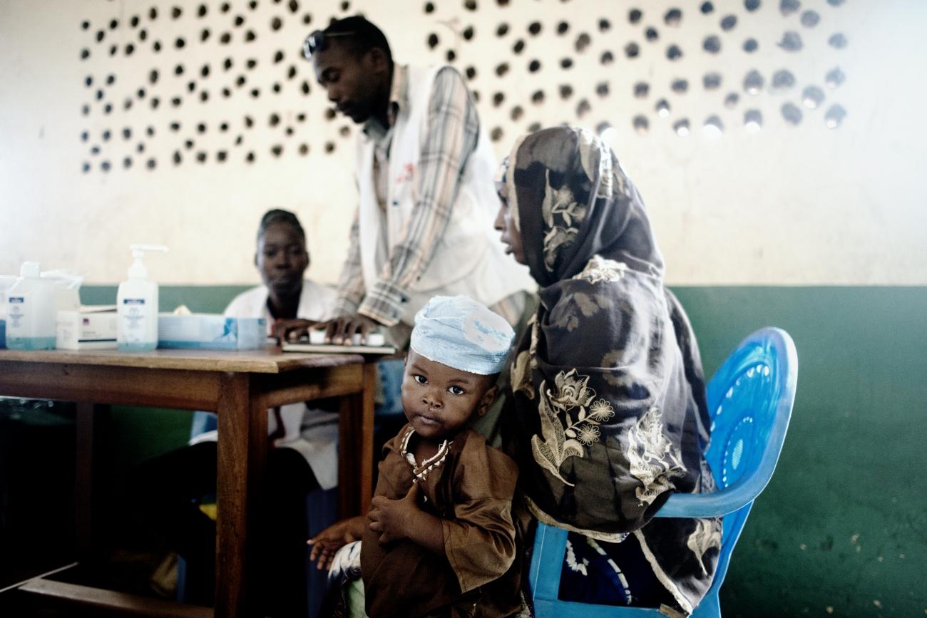 Une famille est reçue au centre de soins de Médecins Sans Frontières (MSF) au camp de déplacés de la Mosquée Centrale, dans le quartier de PK5.