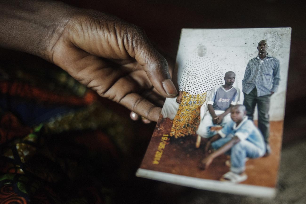 Alima Saboura Zakaria montre une photographie d’elle avec ses trois fils. Amousa Zakaria, à droite au premier rang, est décédé à 23 ans. Il est tombé malade à cause des conditions de vie du camp, et malgré les soins qu’il a reçus de la Croix-Rouge, il n’a pas survécu.
