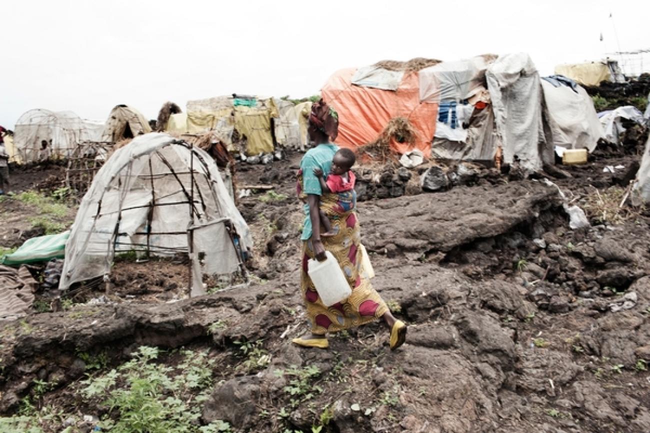 A cause des affrontements entre groupes armés, Cécile (tous les noms ont été changés) a fui la ville de Kashuga avec ses 5 enfants. Elle vit maintenant avec d’autres personnes déplacées sur le site de Bulengo, près de Goma. Les conditions de vie sont ici très précaires. Les gens vivent et dorment à même le sol sur un terrain de roches volcaniques.