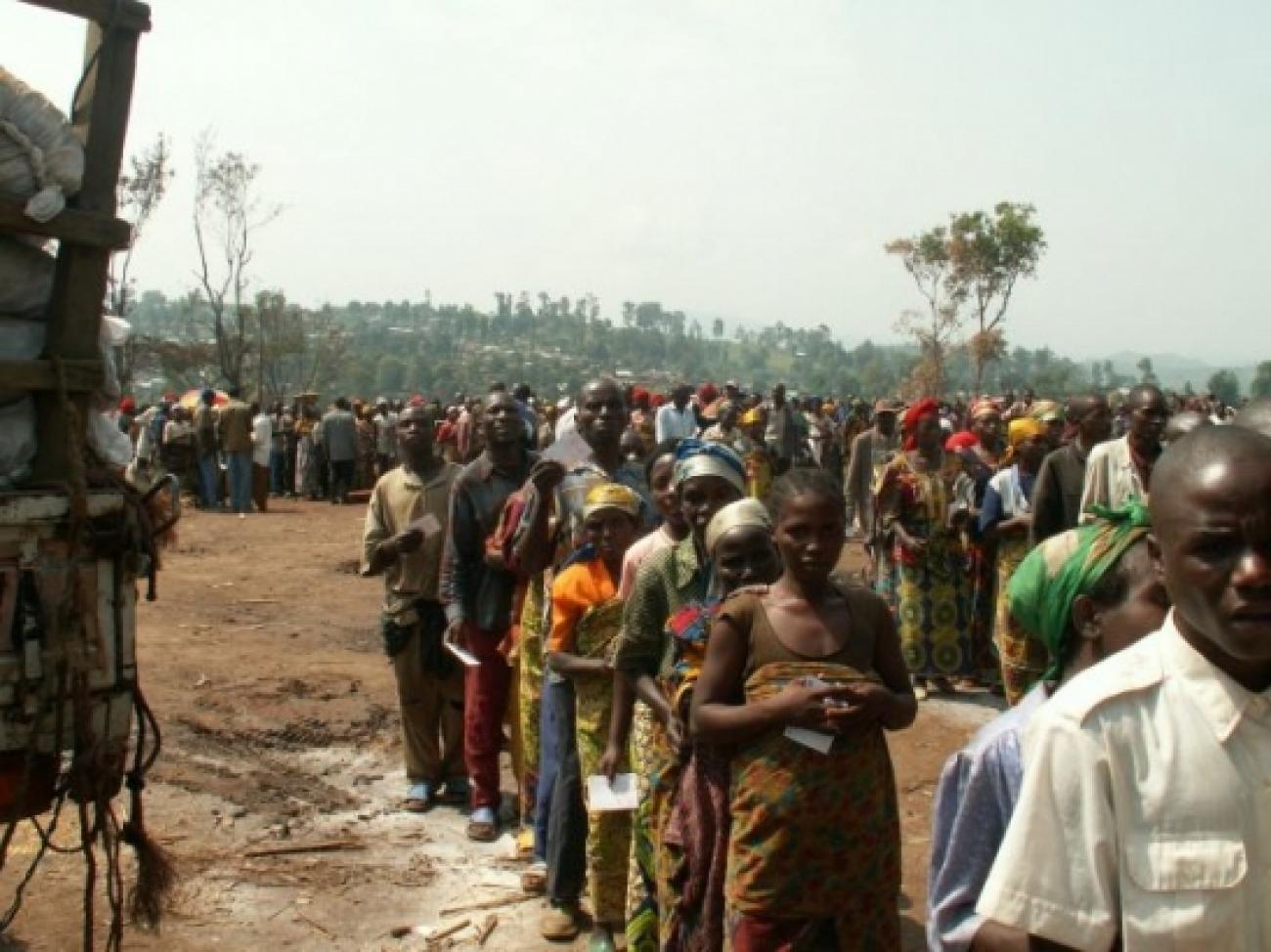 Le jour de la distribution est arrivé. Les familles attendent leur tour pour recevoir ces biens de première nécessité. Au total, plus de 2 200 familles ont reçu un kit de MSF comprenant couvertures, bâches en plastique, savon... © Jean Louis Labeyrie / MSF