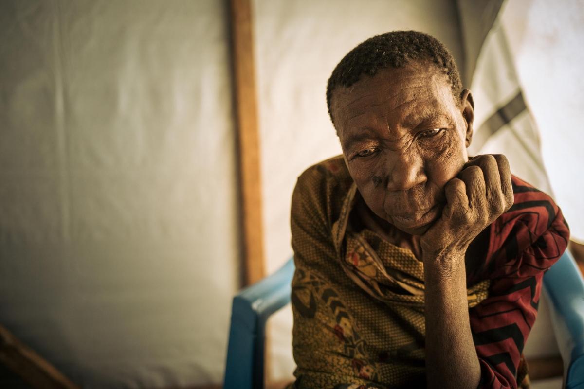 « Je vis dans le camp de Tse Lowi avec mon fils et mes six petits-enfants. Ça fait deux ans que nous avons dû fuir notre village. Des hommes armés y ont fait intrusion alors qu’il faisait déjà nuit, ils ont mis le feu aux maisons et ils ont tué les gens de manière atroce. La femme de mon fils est morte ce soir-là. Ils ont brulé ma maison et nous n'avons eu aucun autre choix que de fuir en pleine nuit sans rien pouvoir emporter, excepté les habits que nous portions. Nous avons marché trois jours et dormi trois nuits dans la brousse pour fuir les assaillants. J’étais effrayée. Nous avons finalement rejoint Tse Lowi le troisième jour », raconte Yvonne, assise devant son abri de paille.