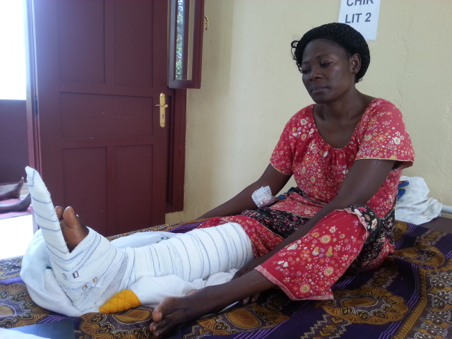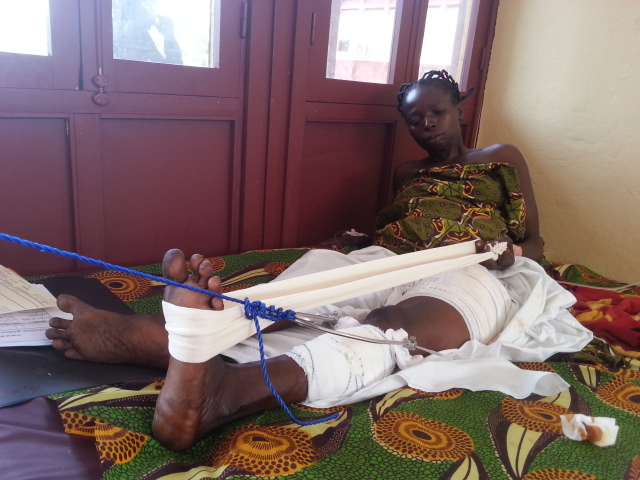 Femme. « Je venais de Bangui, j’étais en transit vers Bria. Je suis arrivée sur Bambari quand les affrontements ont commencé. Je me suis enfuie, je courais, je suis tombée et me suis fracturée la jambe droite. J’ai d’abord été soignée à l’hôpital de Bambari avant d’être transférée par MSF à l’hôpital général de Bangui ».