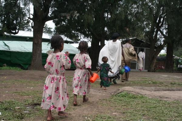 En route vers la réception. Derrière Subo, des petites filles en file indienne. Sheleme ferme la marche, son sachet à la main. Encore très faible, elle grimpe avec peine les trois marches qui mènent à la réception, l'endroit où elle et sa sœur jumelle ont été admises il y a maintenant neuf jours.