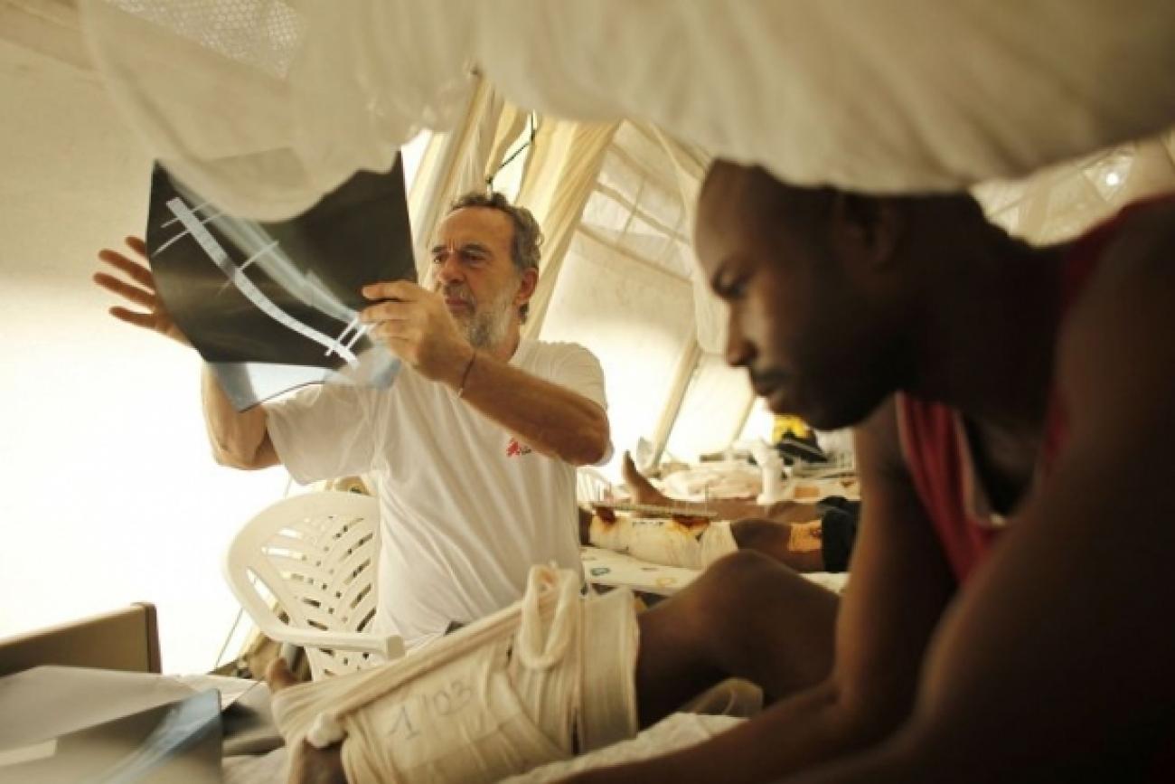 Un chirurgien orthopédique contrôle sur une radio l'évolution d'une fracture. Un fixateur externe a été mis en place. Plus de 7 600 interventions chirurgicales ont été pratiquées depuis le tremblement de terre. Les patients peuvent être suivis, selon les besoins, jusqu'à la rééducation fonctionnelle, comprenant notamment la kinésithérapie et l'aide psychologique.