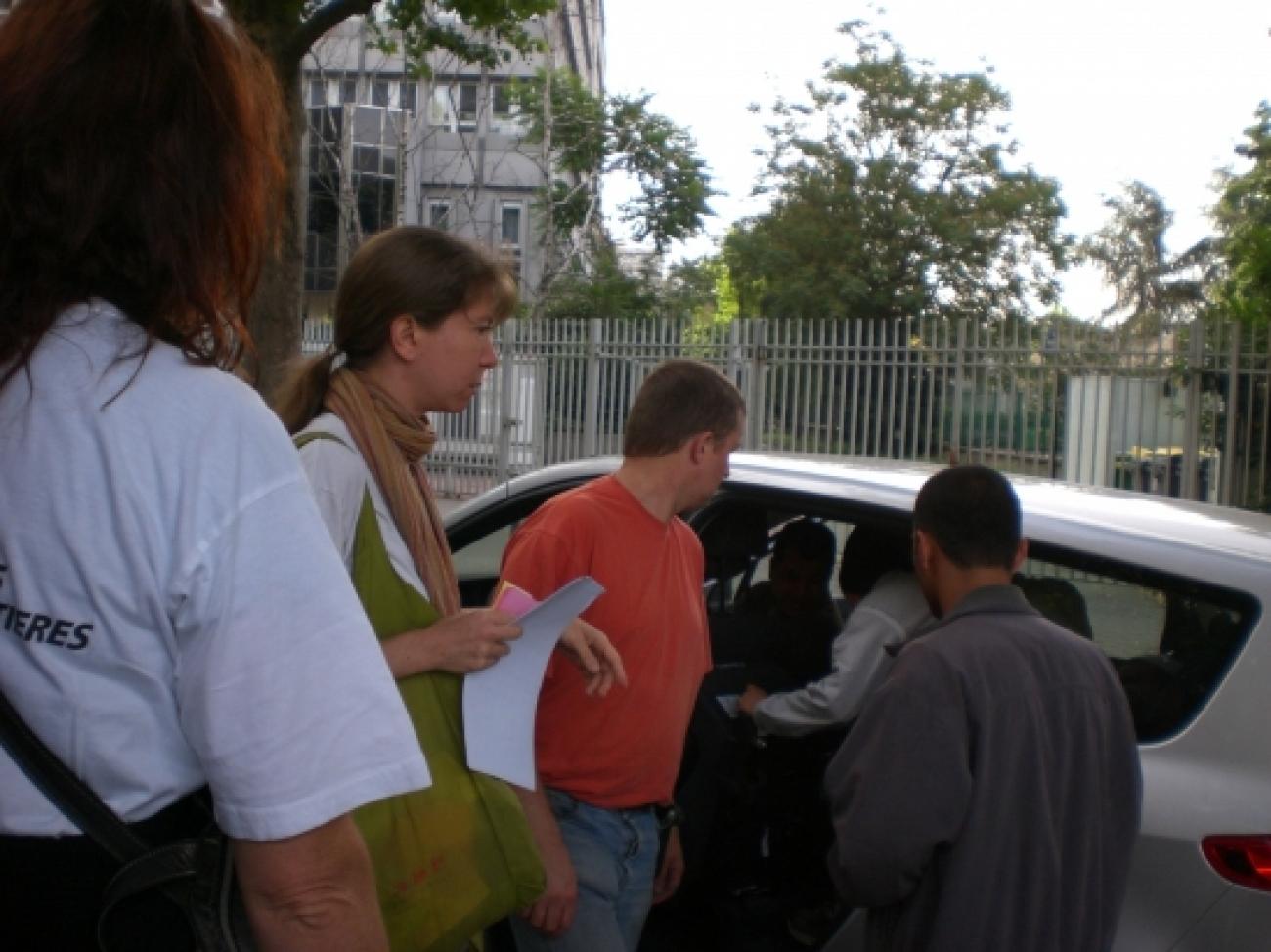 Toutes les vingt minutes, des navettes MSF transportent des groupes de six personnes vers la Place de la Bastille où se trouve le siège de l'organisation. Chacun reçoit un carton de couleur indiquant le moment du départ.