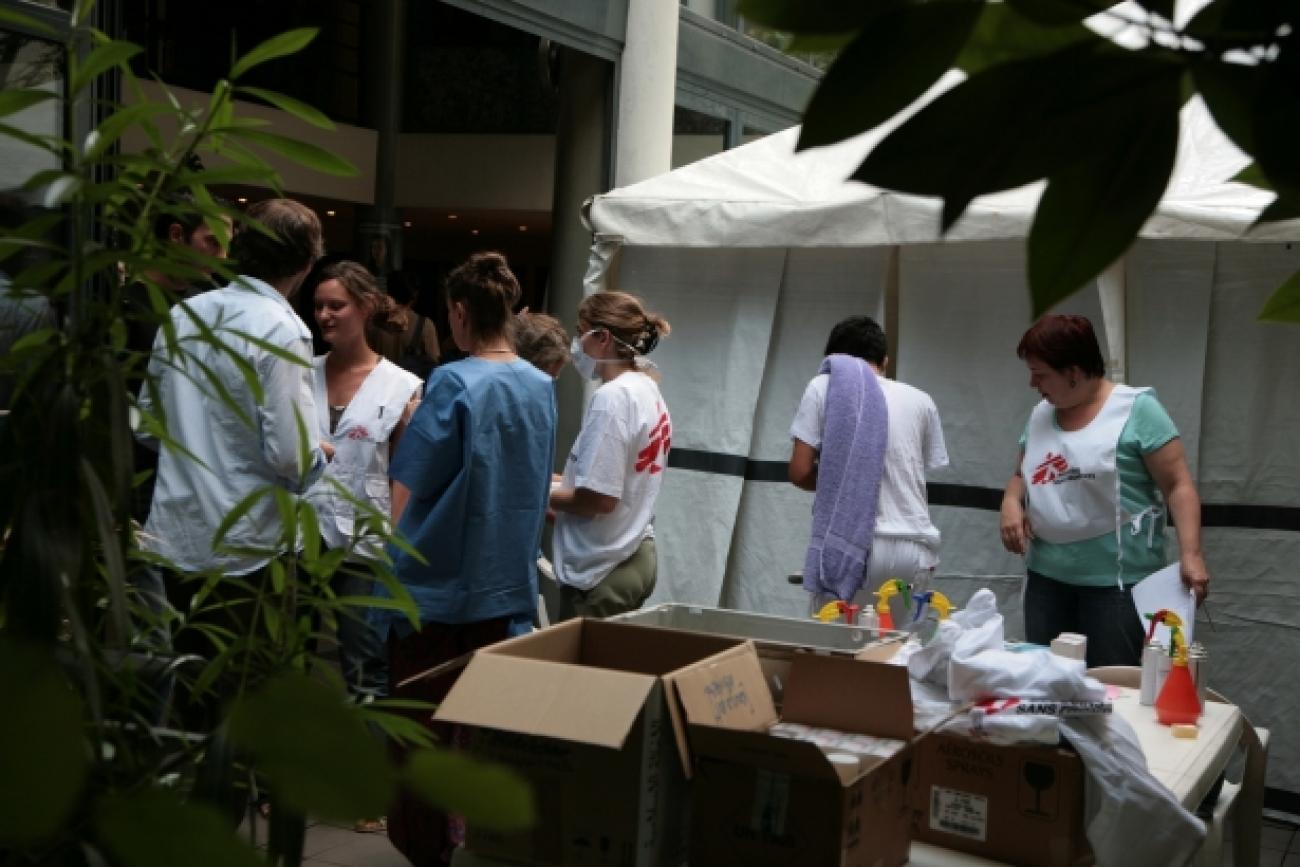 Le siège de MSF a été réaménagé pour l'occasion. Des douches ont été installées dans la cour, des salles de réunion changées en salles d'attente, l'accueil en vestiaire.