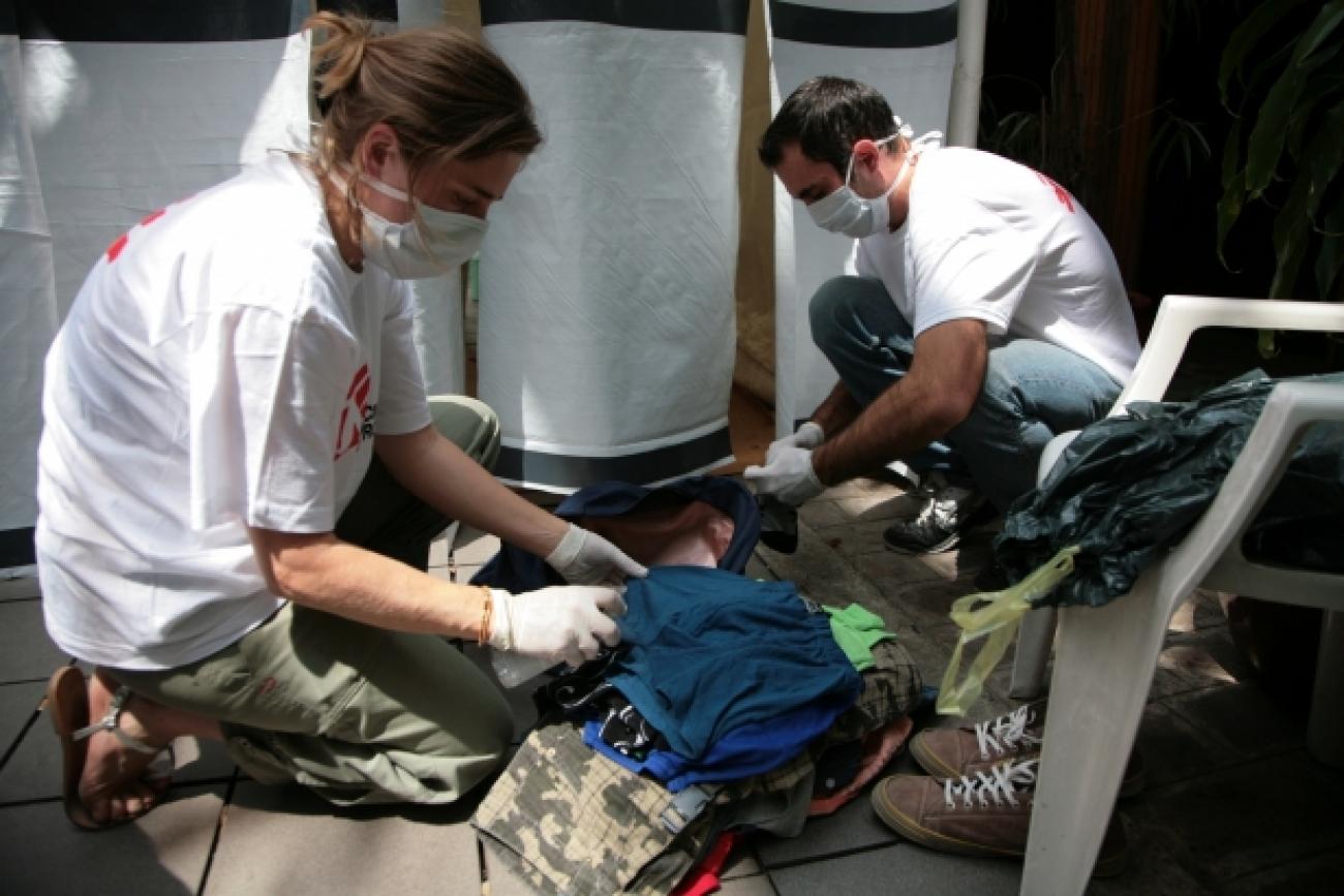 A la sortie de la douche, les patients reçoivent des vêtements propres ainsi qu'un kit d'hygiène. Le lendemain, ils se rendront aux bains douches accompagnés de bénévoles afin de retirer le produit dont ils ont été enduits.