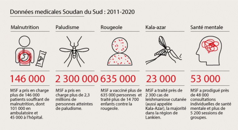 Depuis 2011, 56 attaques ont été commises contre des structures ou des activités gérées par MSF. 24 membres du personnel sud-soudanais de MSF ont été tués, dont cinq alors qu'ils étaient en service. Tous les patients, le personnel de MSF et les communautés où les équipes interviennent ont été touchés directement et indirectement par les conflits et la violence.