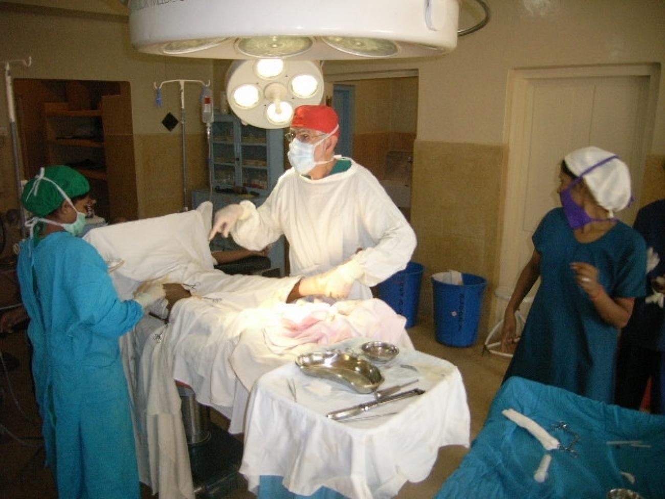 Le chirurgien MSF, Dr Mike Sinclair, en salle d'opération de l'hôpital de Point Pedro. Ici, l'équipe chirurgicale s'apprête à pratiquer une greffe de peau sur un patient présentant une infection au pied. 45% des interventions chirurgicales concernent l'orthopédie et la chirurgie viscérale. Pour les cas plus spécialisés, les patients sont toujours référés sur l'hôpital de Jaffna. On compte près de 203 actes chirurgicaux réalisés pour le seul mois de novembre 2007.