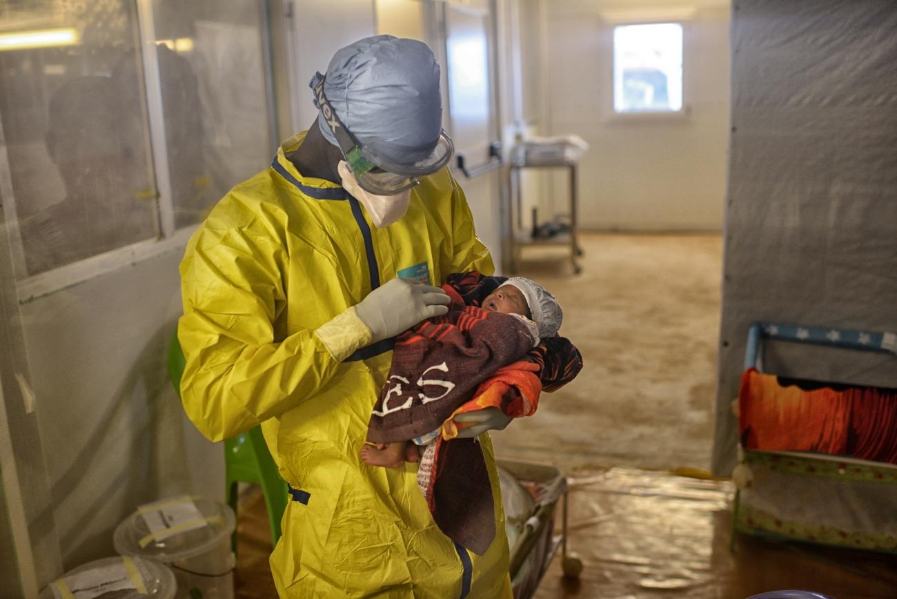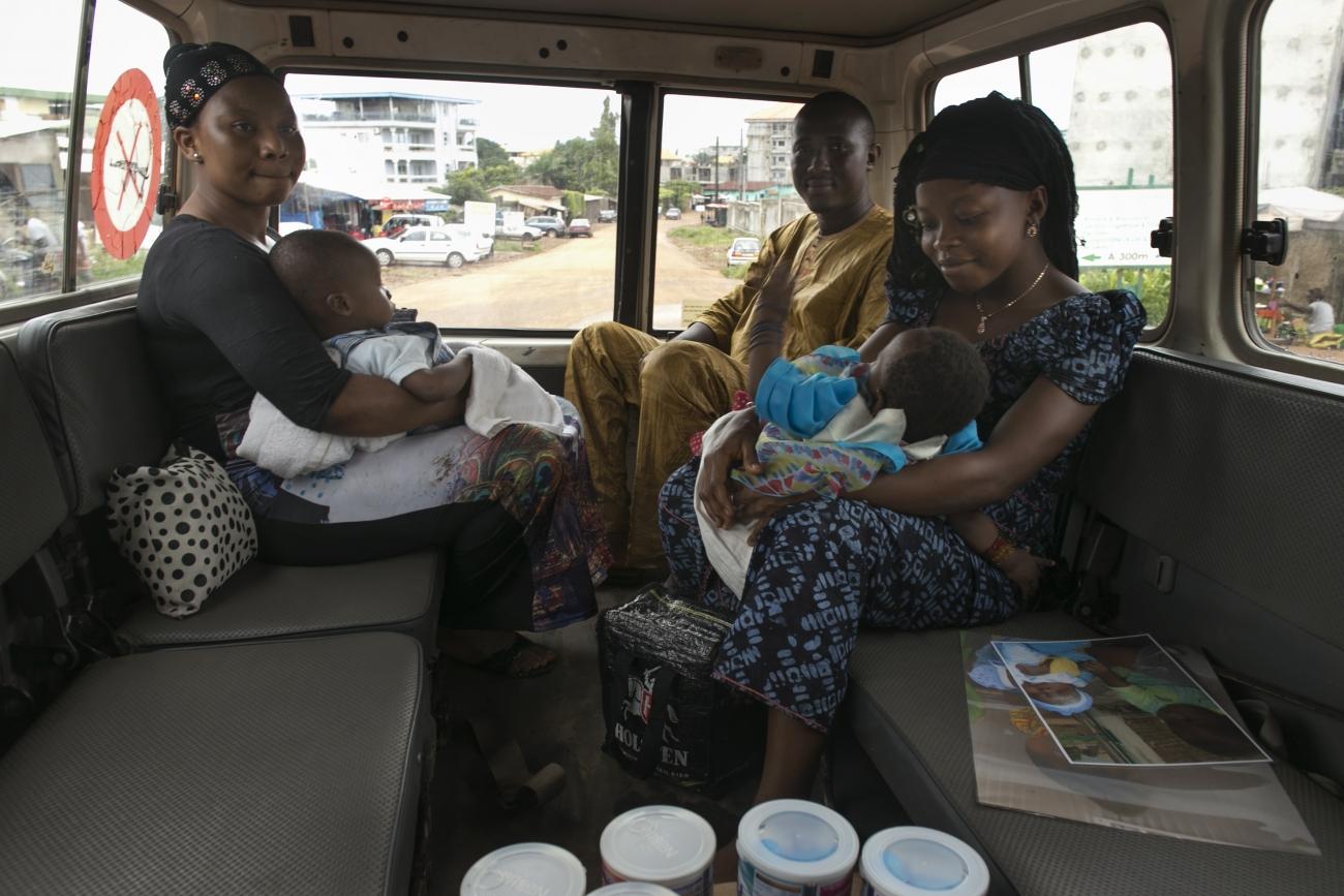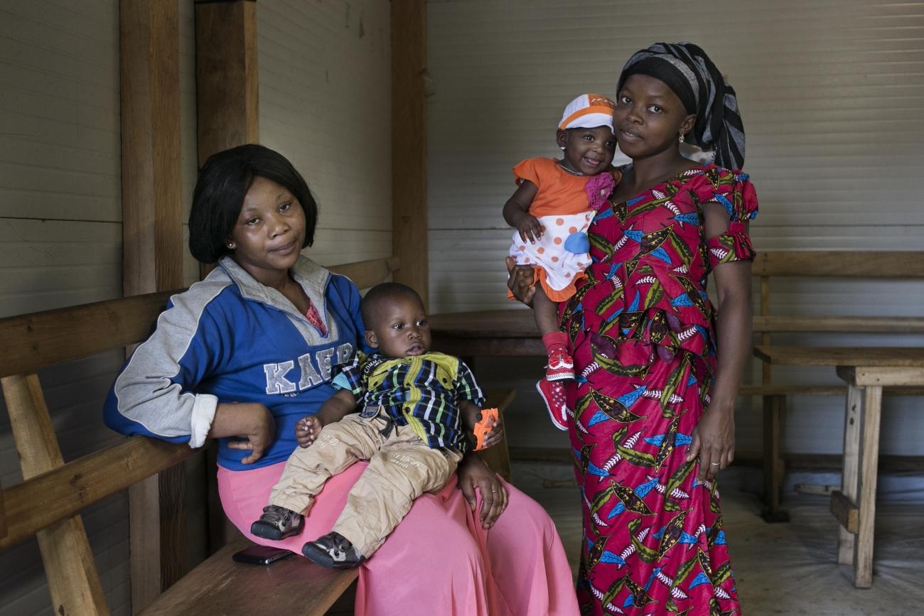 Nubia âgée de 9 mois et son demi-frère de 14 mois M’Bemba ensemble avec leur tante et leur mère adoptive. La mère de Nubia et de M’Bemba est morte du virus Ebola.