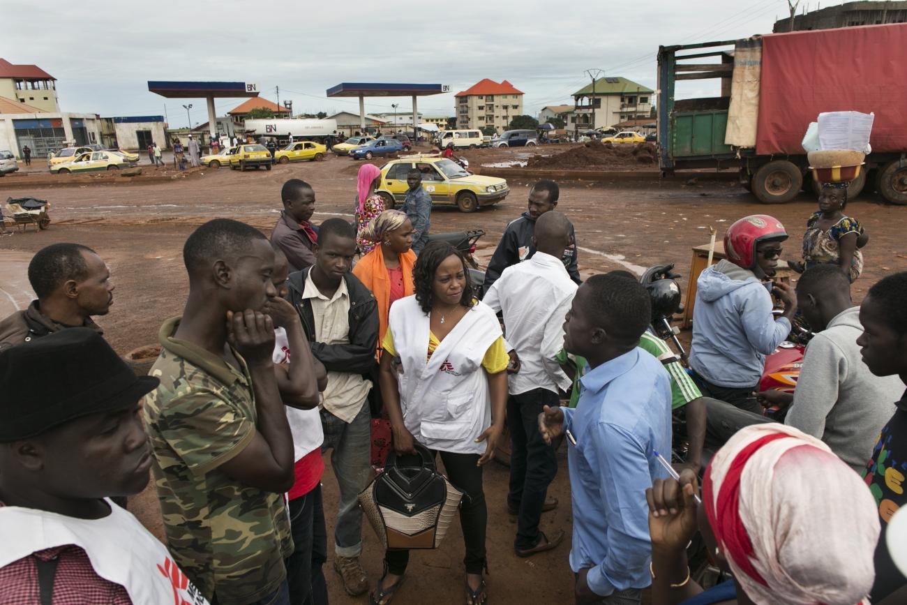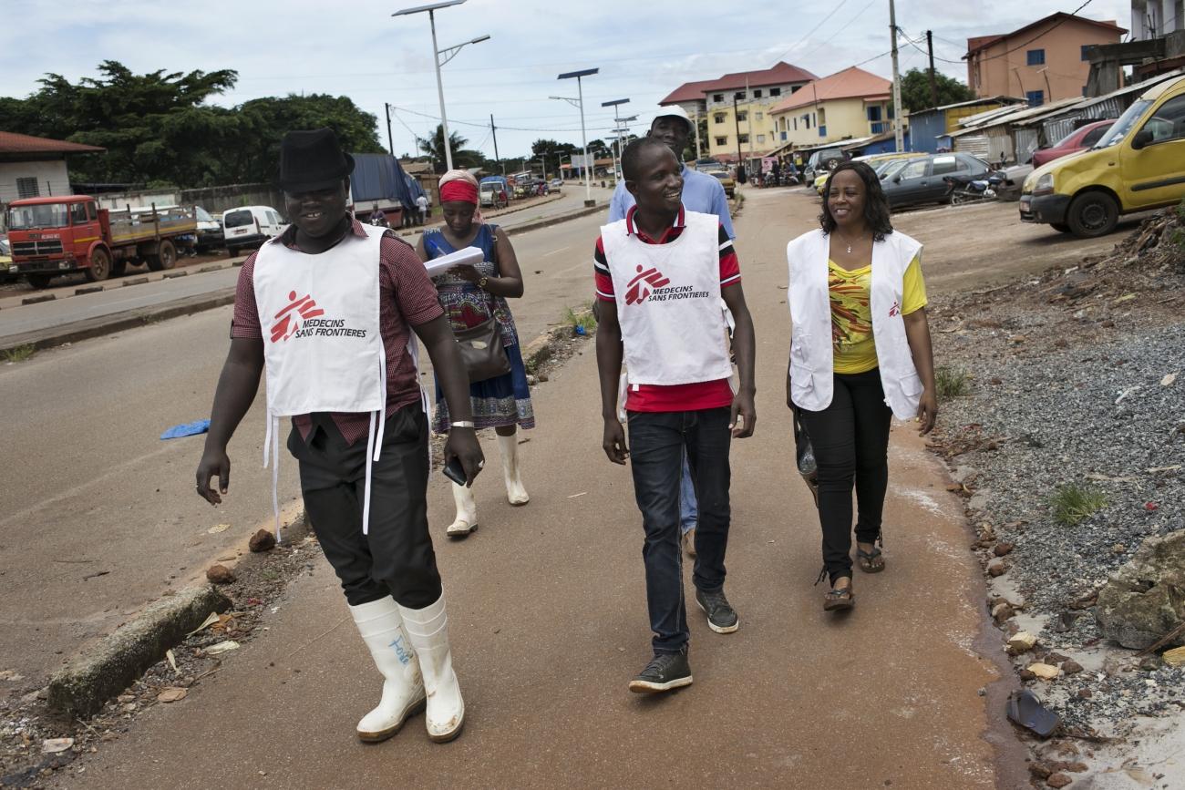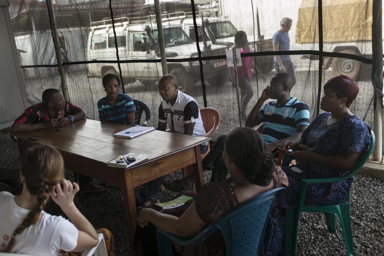 Le référent du projet médical de Médecins Sans Frontières pendant une réunion avec l’équipe du projet «Les survivants d’Ebola». L’équipe va à la rencontre des habitants pour les informer à propos de la maladie Ebola afin de réduire la stigmatisation des anciens malades aujourd’hui guéris.