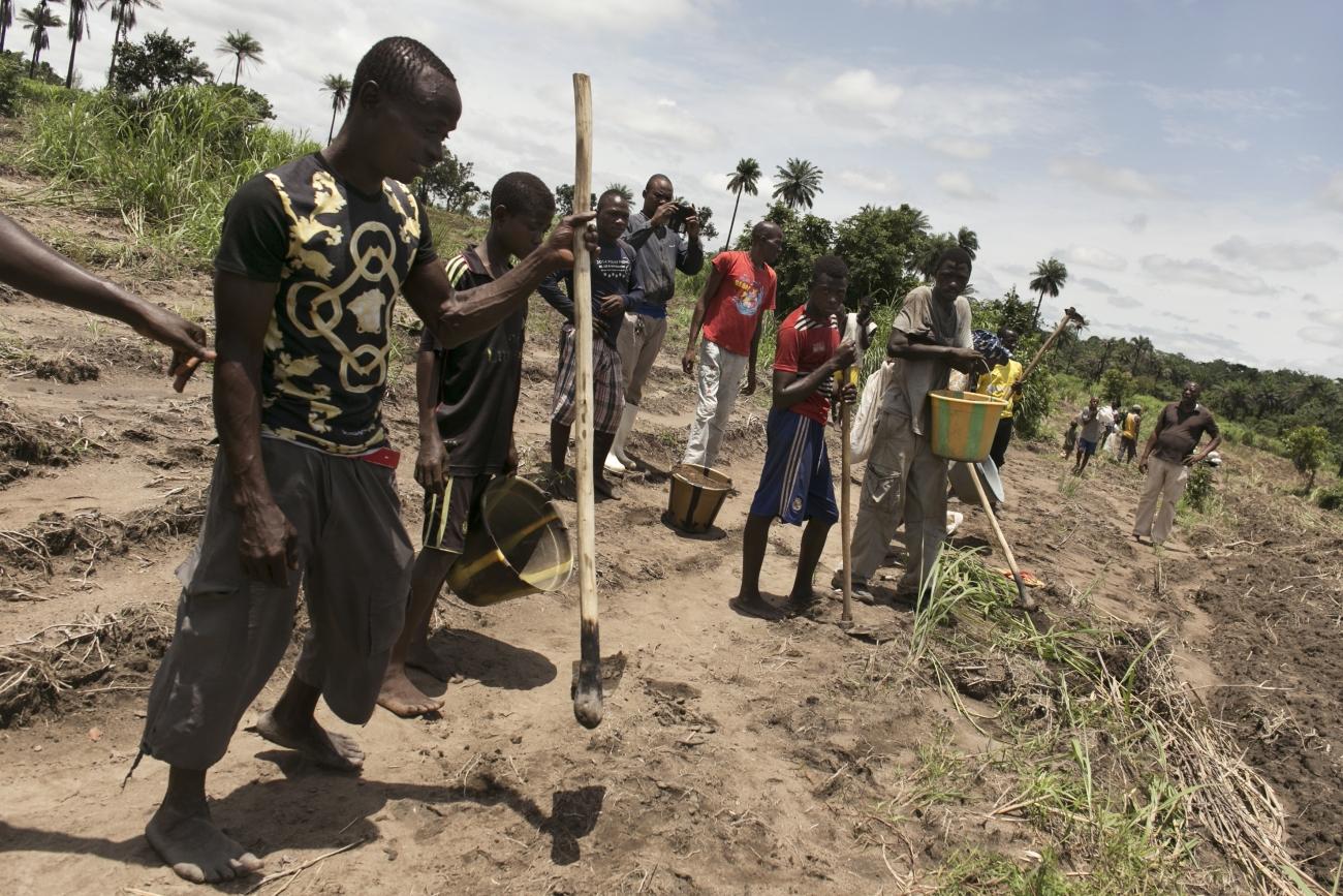 Des membres de l’APGEF – Association des Personnes Guéris d’Ebola de Forecariah – travaillent dans un champ de pastèques. Cette association est très importante dans la lutte contre la stigmatisation des survivants d’Ebola et organise des activités avec des anciens malades et la population. Forecariah est une zone agricole où la majeure partie des habitants vivent de l’agriculture.