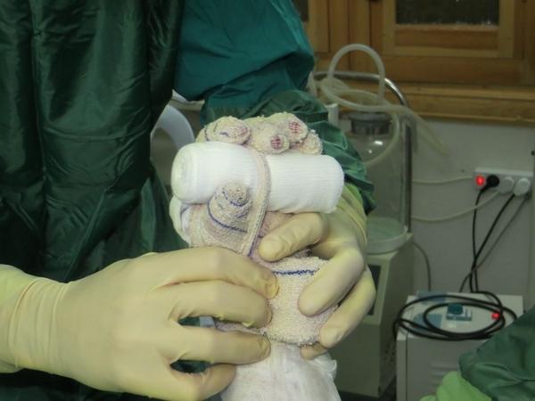 Souvent aussi, le kinésithérapeute de l’équipe MSF doit intervenir au bloc et poser une attelle au genou par exemple pour le maintenir en extension. Ainsi la cicatrisation ne se fera pas en rétraction, autrement dit dans une mauvaise position qui entraînerait une perte de mobilité. C’est ce qu’il a fallu faire pour une petite fille de six ans qui avait été brûlée sur tout le genou. Un autre enfant avait lui été brûlé aux mains et au visage. « Pour la brûlure sur la paume de la main, explique Ricardo, kinésithérapeute MSF, j’ai placé un petit rouleau dans la paume pour préserver la position fonctionnelle, nécessaire pour les activités de la vie quotidienne. »