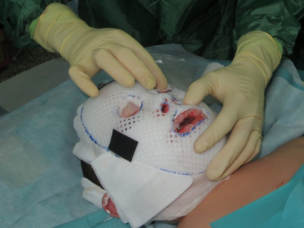 Pour le visage, les soins ont été plus compliqués. Pour éviter une rétraction de la peau lors de la cicatrisation et préserver les traits du visage, un masque thermoformable a été nécessaire. « J’ai couvert le visage de l’enfant avec des compresses stériles et pris une plaque thermoformable pour faire un moulage sur son visage en insistant sur les parties abîmées. Après j’ai fait le plâtre, c’était mon positif. Et j’ai creusé le plâtre à l’endroit des paupières, des narines, des commissures des lèvres… » L’étape suivante a consisté à prendre une autre plaque thermoformable et la placer sur le positif pour obtenir le masque qui a finalement été appliqué sur le visage, sous anesthésie bien entendu.